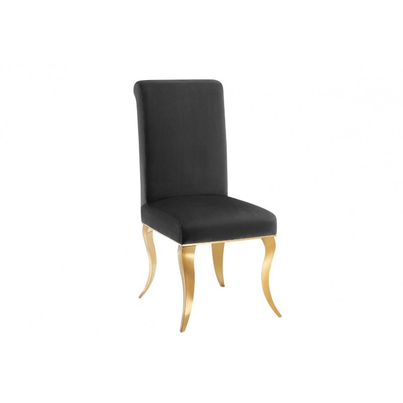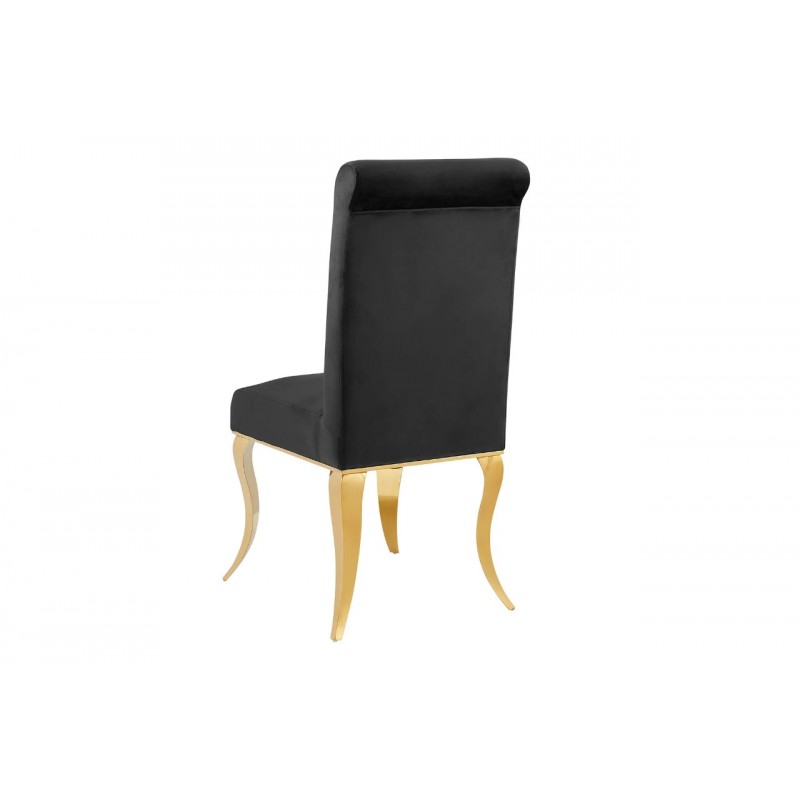 Eleganckie krzesło MODERN BAROCK to mebel, którego tapicerowane siedzisko zostało osadzone na smukłych nogach wykonanych z polerowanej stali nierdzewnej. Korpus mebla obito modną aksamitną tkaniną w kolorze czarnym z pięknym stylowym wykończeniem. Bez wątpienia jego prosty kształt siedziska gwarantujący niesamowitą wygodę wraz z idealnie wyprofilowanym zaokrąglonym oparciem sprawia, że sylwetka siedzącego podczas jego użytkowania jest odpowiednio wspierana. Ponadto oryginalne krzywizny oraz zdobienia złotej metalowej podstawy nadają mu wyjątkowy design, przez co całość mebla prezentuje się fenomenalnie. Krzesło zostało stworzone głównie z myślą o użytkownikach ceniących sobie funkcjonalność oraz stylowe wykończenie. Charakterystyczną jego cechą jest podstawa oraz tkanina, która sprawia, że wygląda bardzo elegancko, idealnie komponując się do wnętrza w stylu glamour, barokowym oraz nowoczesnym.