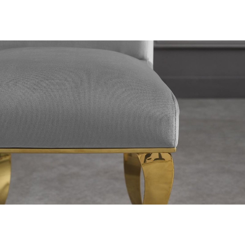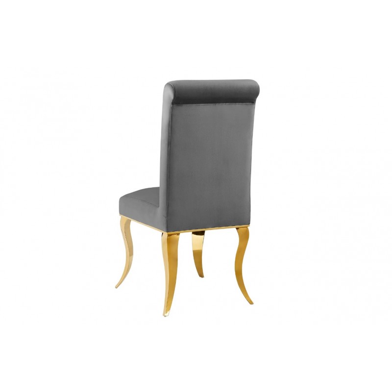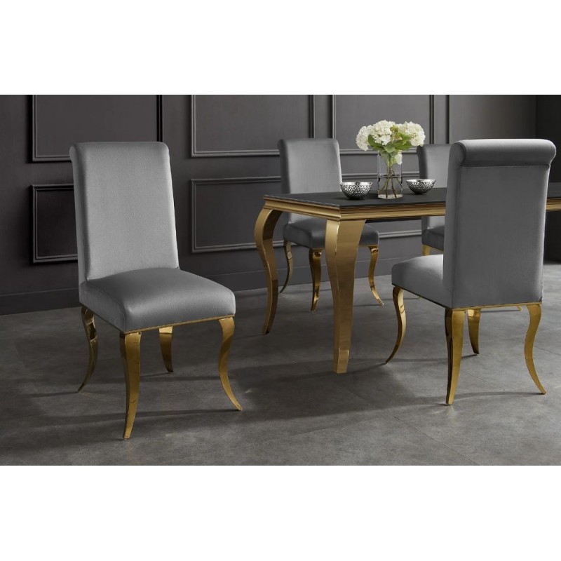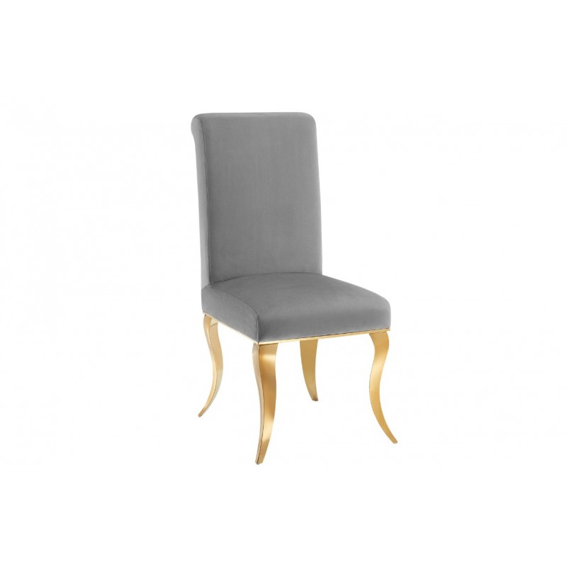 Eleganckie krzesło MODERN BAROCK to mebel, którego tapicerowane siedzisko zostało osadzone na smukłych nogach wykonanych z polerowanej stali nierdzewnej. Korpus mebla obito modną aksamitną tkaniną w kolorze szarym z pięknym stylowym wykończeniem. Bez wątpienia jego prosty kształt siedziska gwarantujący niesamowitą wygodę wraz z idealnie wyprofilowanym zaokrąglonym oparciem sprawia, że sylwetka siedzącego podczas jego użytkowania jest odpowiednio wspierana. Ponadto oryginalne krzywizny oraz zdobienia złotej metalowej podstawy nadają mu wyjątkowy design, przez co całość mebla prezentuje się fenomenalnie. Krzesło zostało stworzone głównie z myślą o użytkownikach ceniących sobie funkcjonalność oraz stylowe wykończenie. Charakterystyczną jego cechą jest podstawa oraz tkanina, która sprawia, że wygląda bardzo elegancko, idealnie komponując się do wnętrza w stylu glamour, barokowym oraz nowoczesnym.