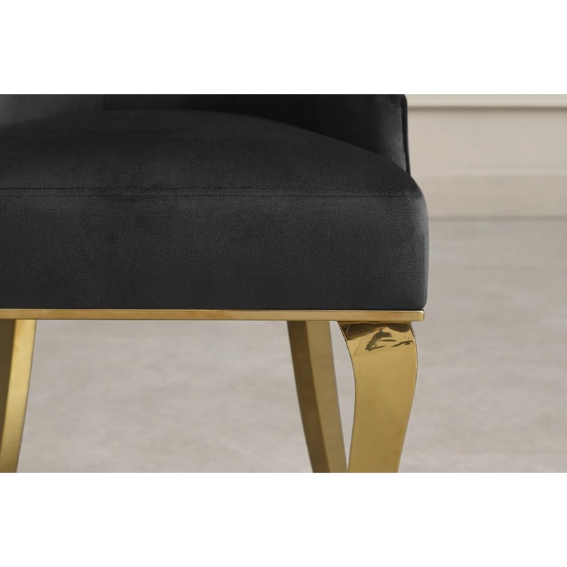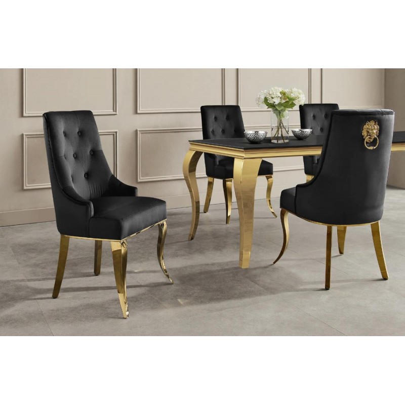 Krzesło MODERN BAROCK to wyjątkowy mebel łączący luksusowy design z wysokim komfortem użytkowania. Tapicerowane siedzisko osadzono na smukłych złotych nogach wykonanych ze stali nierdzewnej, które nadają konstrukcji lekkości i nowoczesnej elegancji. Korpus krzesła obito modną aksamitną tkaniną w czarnym kolorze, wzbogaconą o stylowe wykończenie. Charakterystyczny kształt siedziska, subtelne krzywizny oraz efektowne pikowanie materiałowymi guzikami na wewnętrznej stronie oparcia tworzą unikatową całość. Idealnie wyprofilowane, zaokrąglone oparcie zapewnia doskonałe podparcie sylwetki i wysoki komfort nawet podczas jego użytkowania. Dodatkowym elementem dekoracyjnym jest srebrna kołatka w formie głowy lwa, osadzona z tyłu oparcia, która podkreśla barokowy charakter krzesła i nadaje mu wyrafinowanego stylu. Krzesło zostało stworzone głównie z myślą o użytkownikach ceniących sobie funkcjonalność oraz stylowe wykończenie. Charakterystyczną jego cechą jest podstawa oraz tkanina, która sprawia, że wygląda bardzo elegancko, idealnie komponując się do wnętrza w stylu glamour, barokowym oraz nowoczesnym.