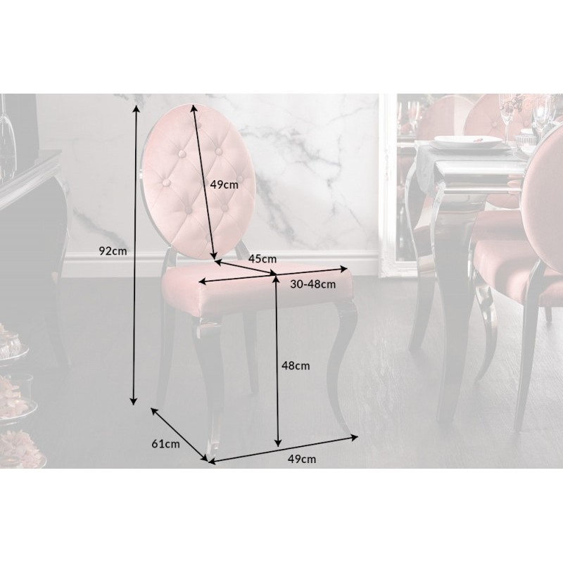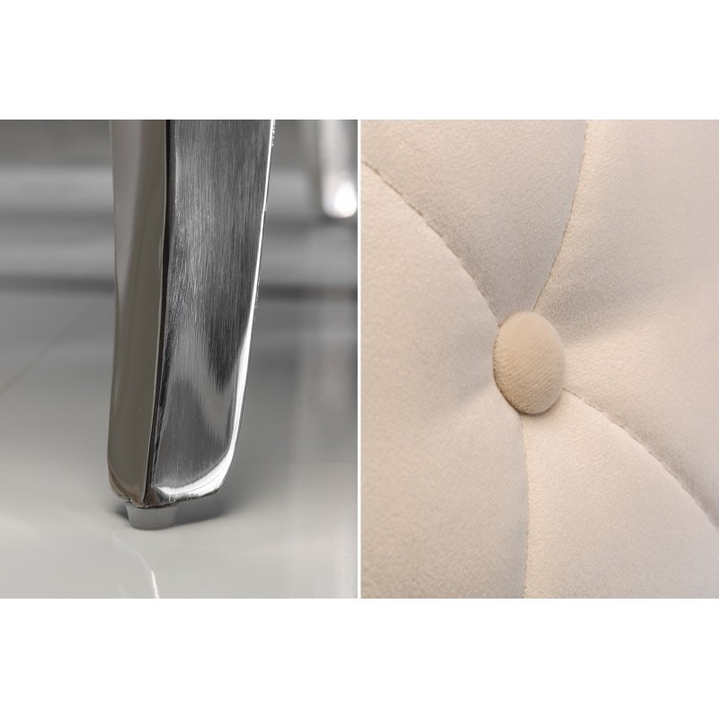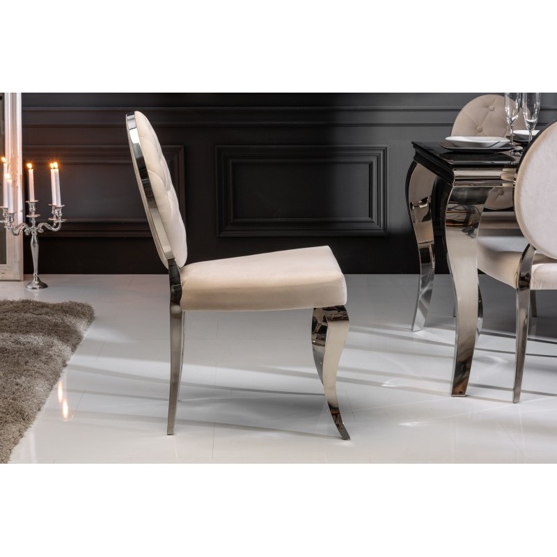 Krzesło Modern Barock to mebel w stylu glamour z tapicerowanym aksamitną tkaniną siedziskiem. Pikowania na oparciu dodają elegancji. Nogi wykonane z polerowanej stali nierdzewnej.
