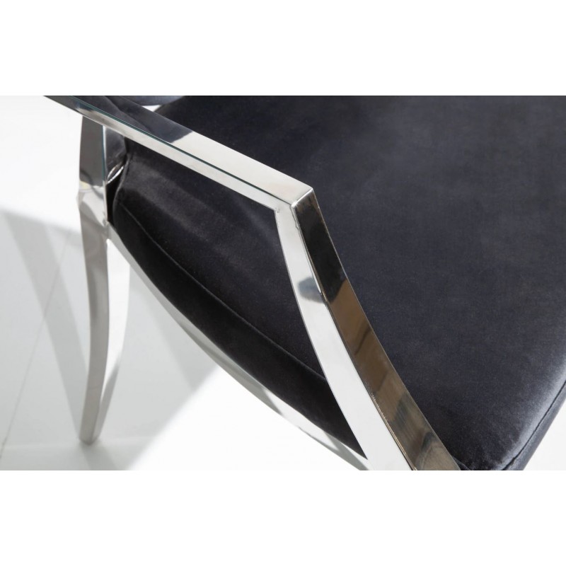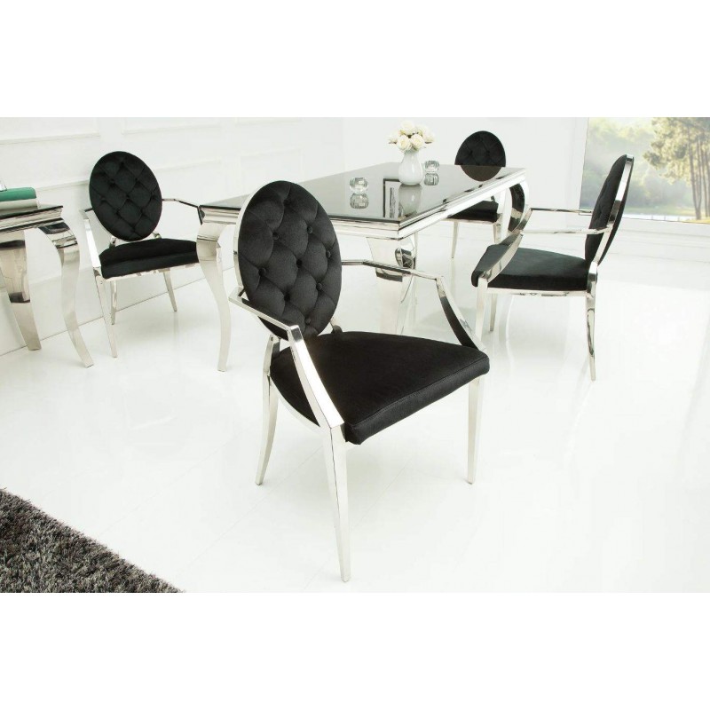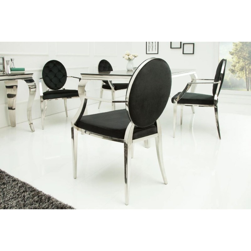 Krzesło Modern Barock to mebel w stylu glamour z tapicerowanym aksamitną tkaniną siedziskiem. Pikowania na oparciu dodają elegancji. Nogi wykonane z polerowanej stali nierdzewnej. W serii Modern Barock występuję stół do kompletu.
