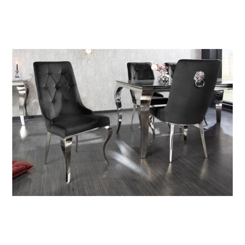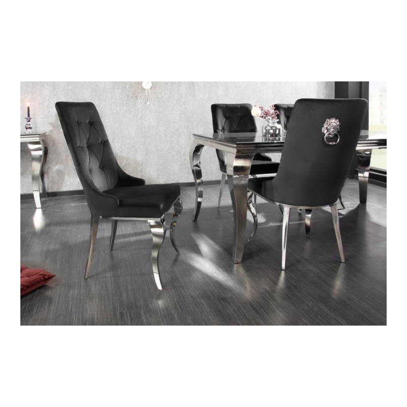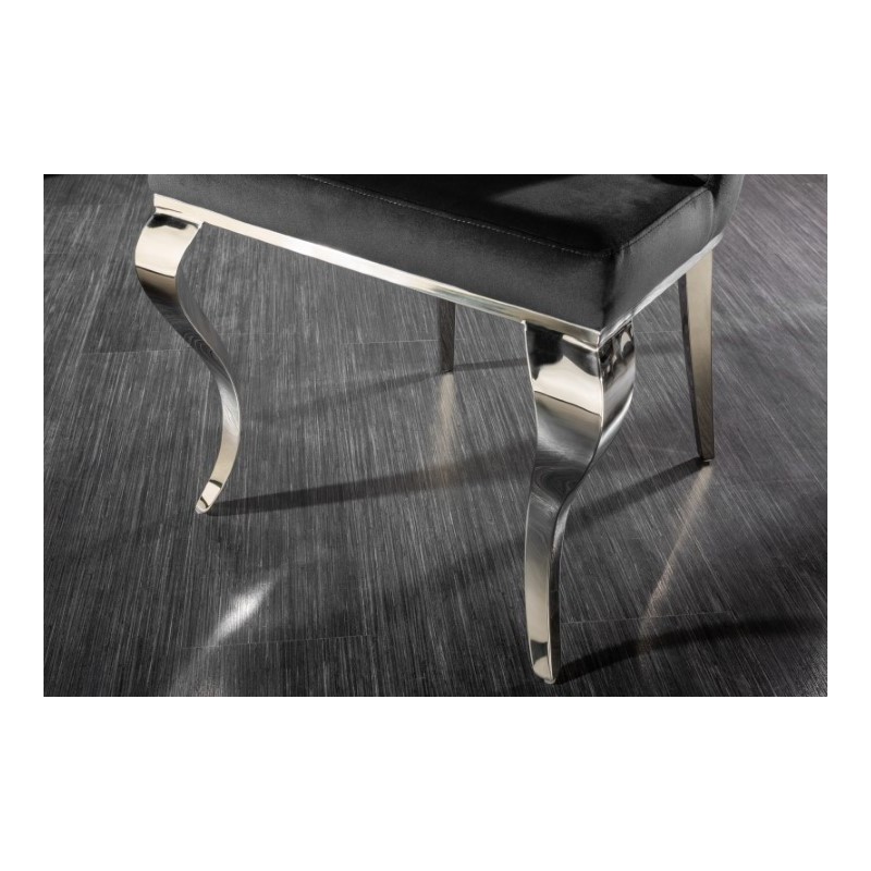 Krzesło Modern Barock to mebel w stylu glamour. Siedzisko wykonane z tkaniny welurowej, przyjemnej dla skóry, natomiast nogi ze stali nierdzewnej. Ozdobne pikowania na oparciu całości nadają eleganckiego barokowego wyglądu.
