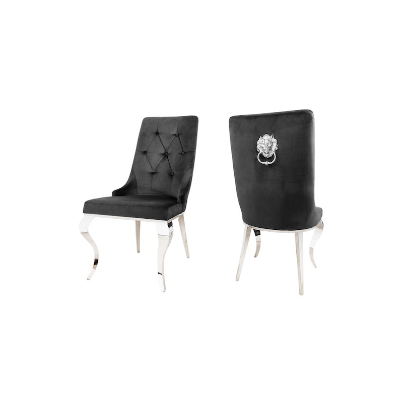 KRZESŁO MODERN BAROCK Z GŁOWĄ LWA SZARO-SREBRNE WELUR Luksusowe krzesło Modern Barock to mebel w stylu glamour. Szare siedzisko wykonane zostało z tkaniny welurowej, przyjemnej dla skóry, i łatwej w utrzymaniu czystości, natomiast nogi ze stali nierdzewnej. Ozdobne pikowania na oparciu oraz srebrna głowa lwa całości nadają eleganckiego barokowego wyglądu....