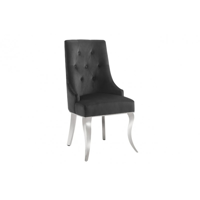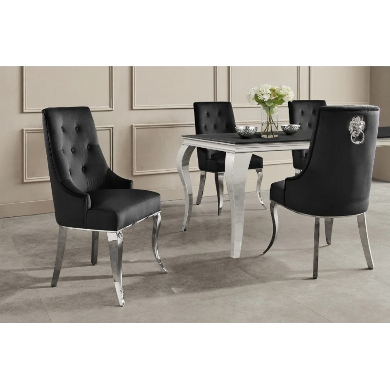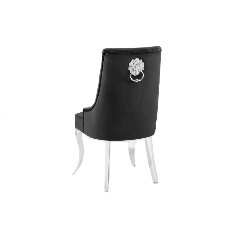 Krzesło MODERN BAROCK to wyjątkowy mebel łączący luksusowy design z wysokim komfortem użytkowania. Tapicerowane siedzisko osadzono na smukłych srebrnych nogach wykonanych ze stali nierdzewnej, które nadają konstrukcji lekkości i nowoczesnej elegancji. Korpus krzesła obito modną aksamitną tkaniną w czarnym kolorze, wzbogaconą o stylowe wykończenie. Charakterystyczny kształt siedziska, subtelne krzywizny oraz efektowne pikowanie materiałowymi guzikami na wewnętrznej stronie oparcia tworzą unikatową całość. Idealnie wyprofilowane, zaokrąglone oparcie zapewnia doskonałe podparcie sylwetki i wysoki komfort nawet podczas jego użytkowania. Dodatkowym elementem dekoracyjnym jest srebrna kołatka w formie głowy lwa, osadzona z tyłu oparcia, która podkreśla barokowy charakter krzesła i nadaje mu wyrafinowanego stylu. Krzesło zostało stworzone głównie z myślą o użytkownikach ceniących sobie funkcjonalność oraz stylowe wykończenie. Charakterystyczną jego cechą jest podstawa oraz tkanina, która sprawia, że wygląda bardzo elegancko, idealnie komponując się do wnętrza w stylu glamour, barokowym oraz nowoczesnym.