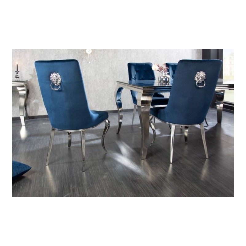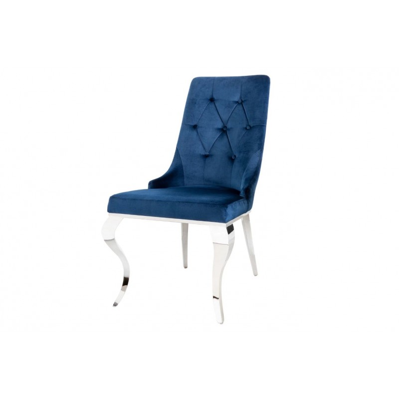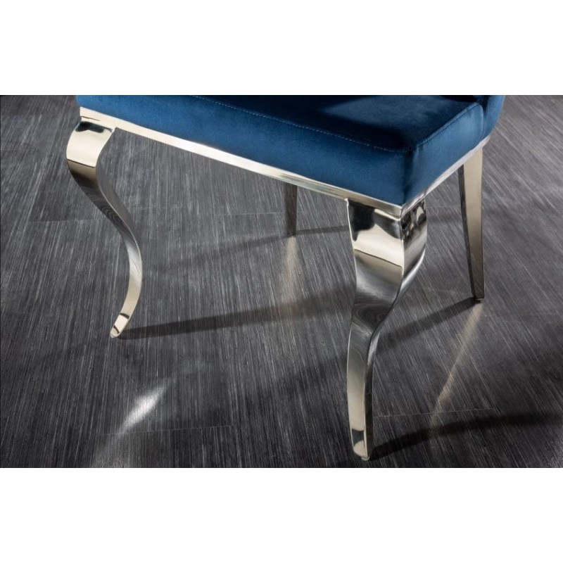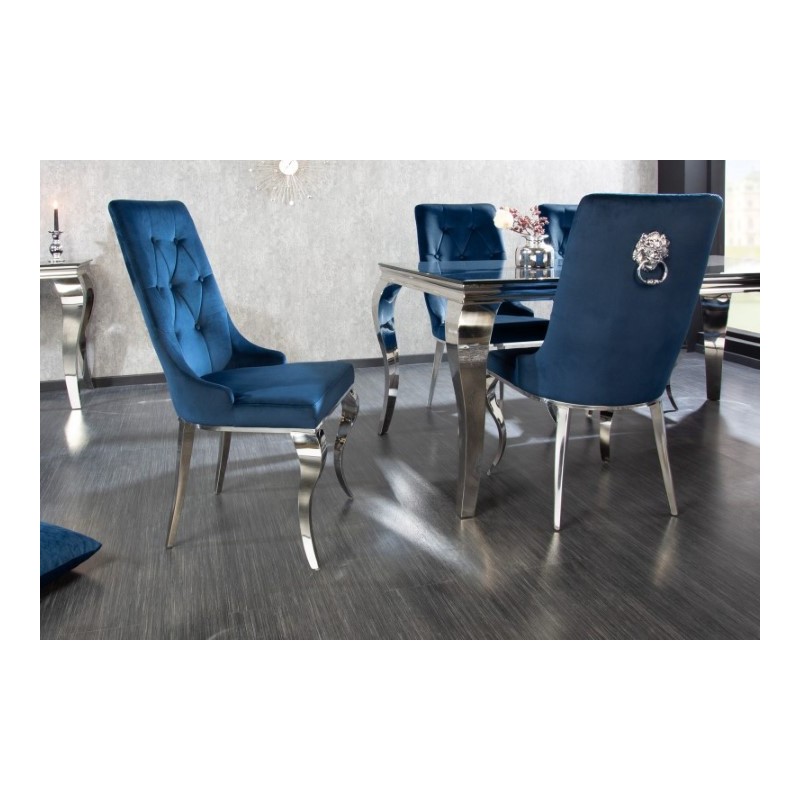 Luksusowe krzesło Modern Barock to mebel w stylu glamour. Siedzisko wykonane z granatowej tkaniny welurowej, przyjemnej dla skóry, natomiast nogi ze stali nierdzewnej. Ozdobne pikowania na oparciu całości nadają eleganckiego barokowego wyglądu.