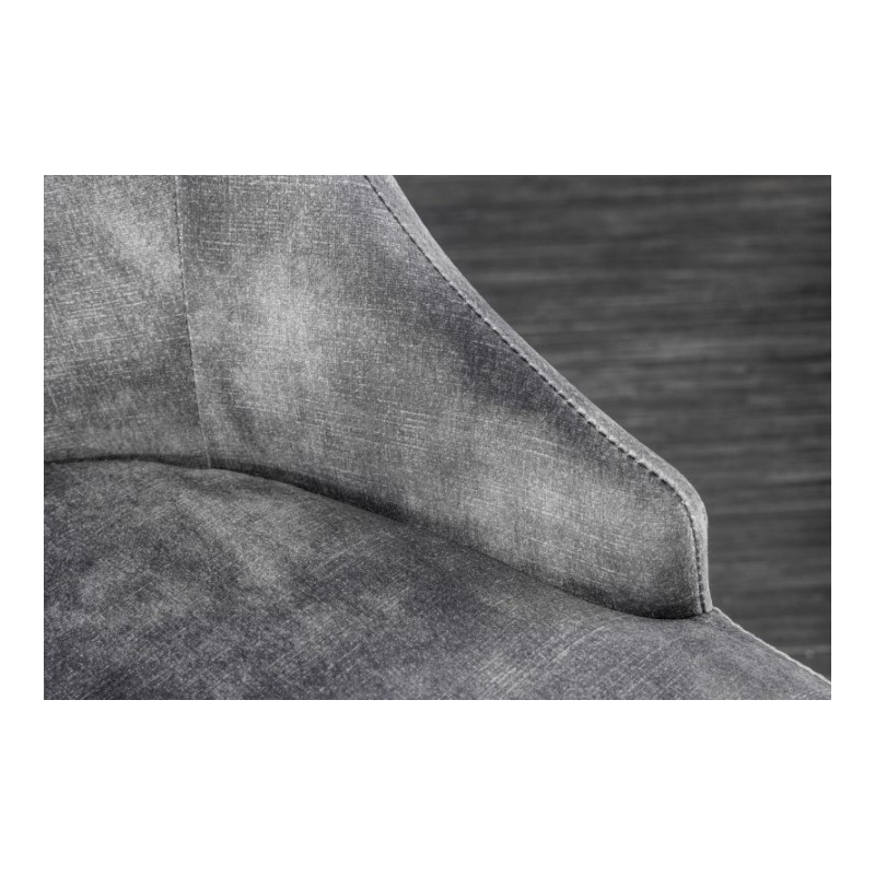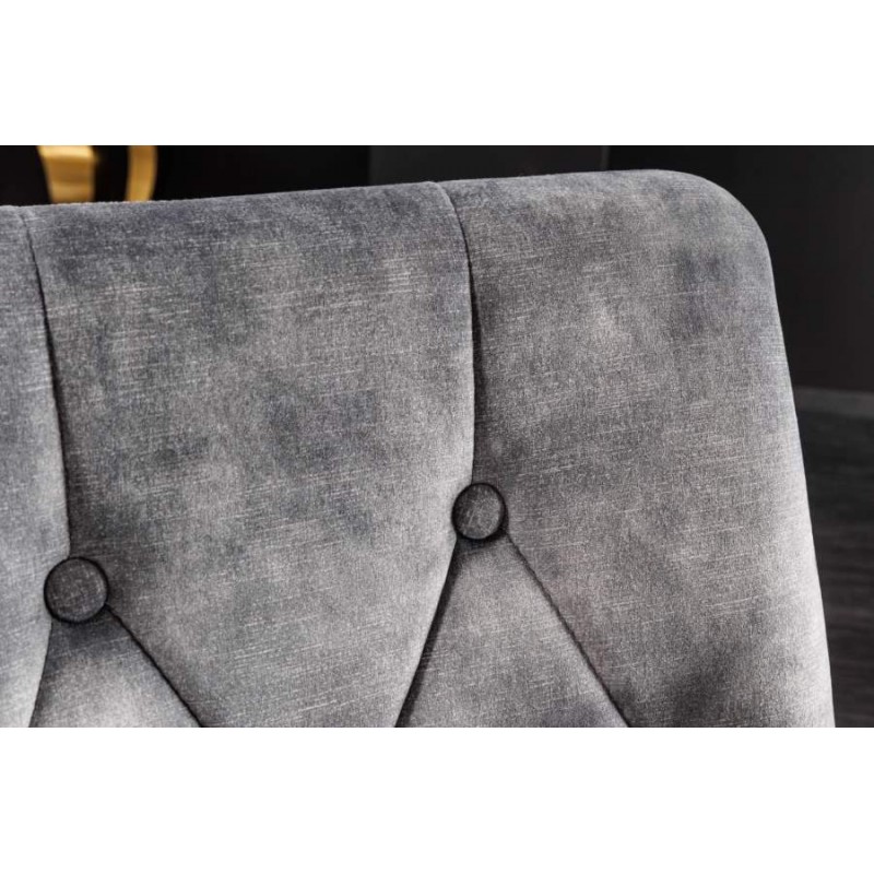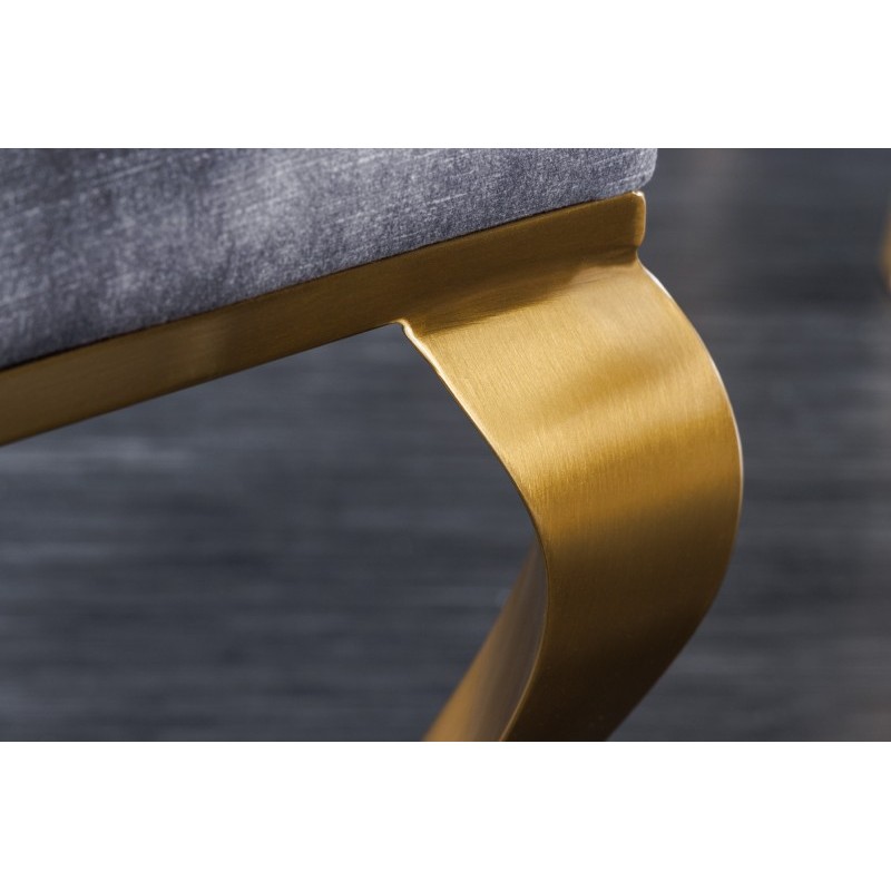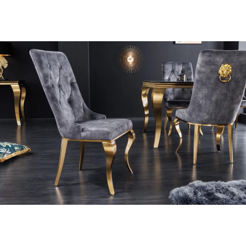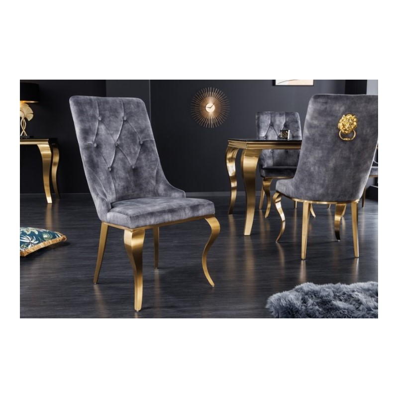Eleganckie krzesło Modern Barock znajdzie zastosowanie w nowoczesnym wnętrzu urządzonym w stylu glamour. Szare siedzisko oraz oparcie z ozdobnym pikowaniem wykonane zostały z tkaniny welurowej, przyjemnej dla skóry i łatwej w utrzymaniu czystości, natomiast nogi ze stali nierdzewnej, lakierowanej na kolor złoty.