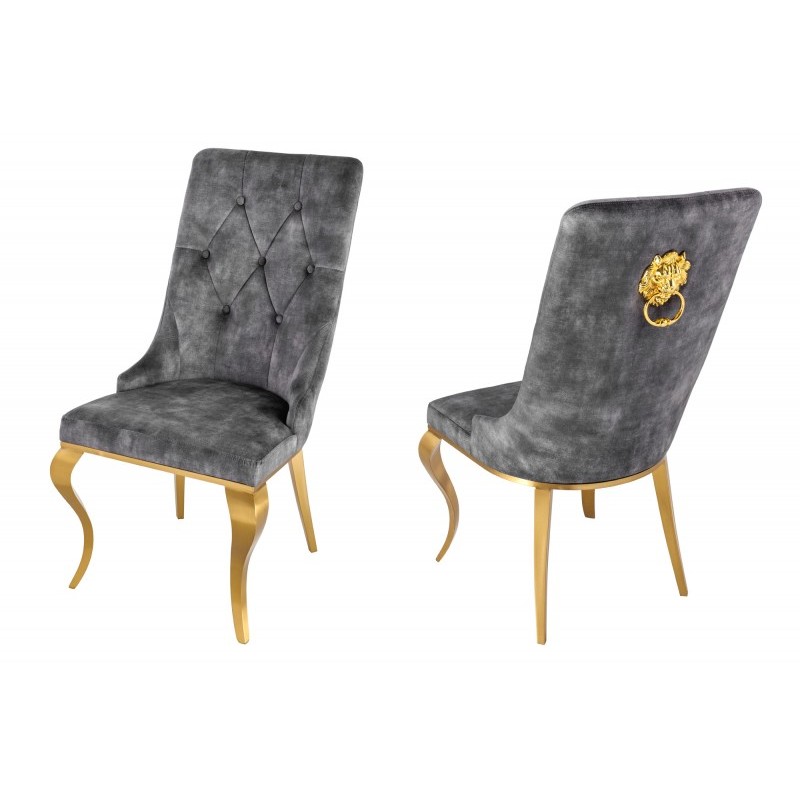 KRZESŁO MODERN BAROCK Z GŁOWĄ LWA WELUR SZARY Luksusowe krzesło Modern Barock to mebel w stylu glamour. Szare siedzisko wykonane zostało z tkaniny welurowej, przyjemnej dla skóry, i łatwej w utrzymaniu czystości, natomiast nogi ze stali nierdzewnej. Ozdobne pikowania na oparciu oraz srebrna głowa lwa całości nadają eleganckiego barokowego wyglądu. W...