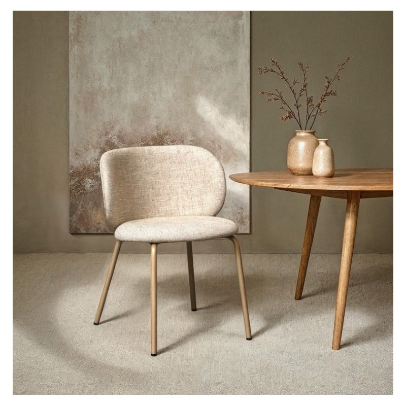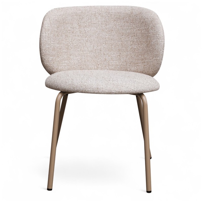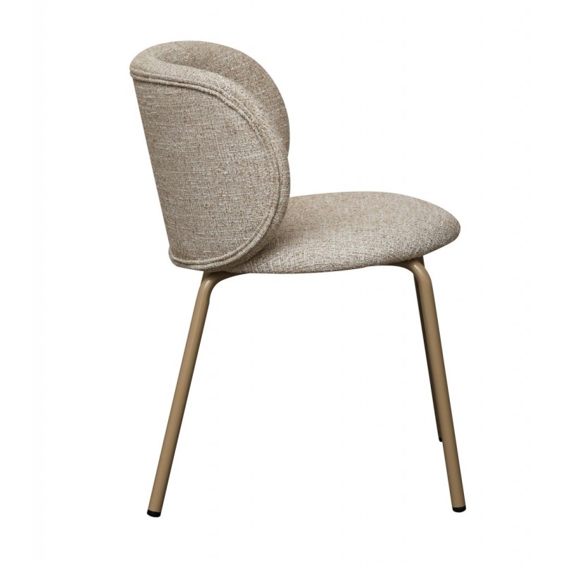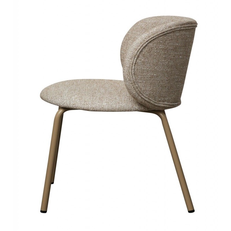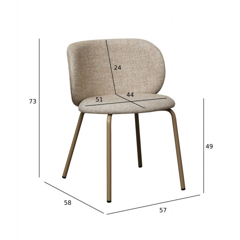 Krzesło NANNA to mebel, którego tapicerowane siedzisko zostało postawione na beżowej smukłej metalowej podstawie. Siedzisko obite zostało modną tkaniną w odcieniach beżu, którego wyjątkowy charakter podkreśla gramatura zastosowanej na nim tkaniny Boucle. Bez wątpienia kubełkowy kształt siedziska gwarantuję wygodę, a wyprofilowane oparcie odpowiednio wspiera sylwetkę siedzącego podczas jego użytkowania. Ponadto oryginalne krzywizny, wygodne siedzisko oraz metalowa podstawa nadają mu wyjątkowy design. Krzesło to stworzone zostało głównie z myślą o użytkownikach ceniących sobie funkcjonalność oraz stylowe wykończenie. Charakterystyczną jego cechą jest tkanina, która zwiększa komfort użytkowania sprawiając, że wygląda bardzo elegancko, idealnie komponując się do stylu nowoczesnego wnętrza.