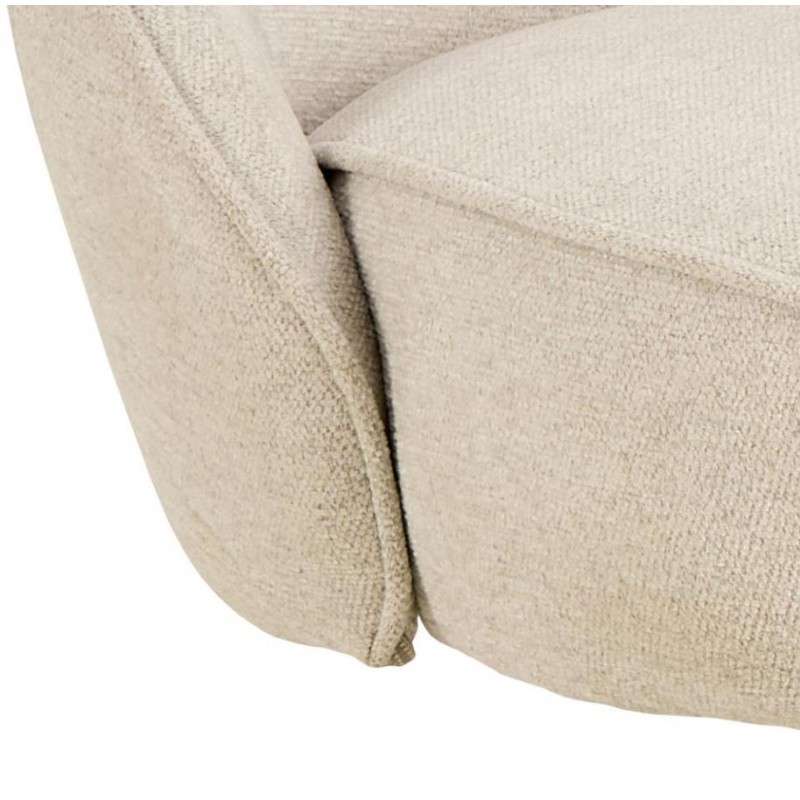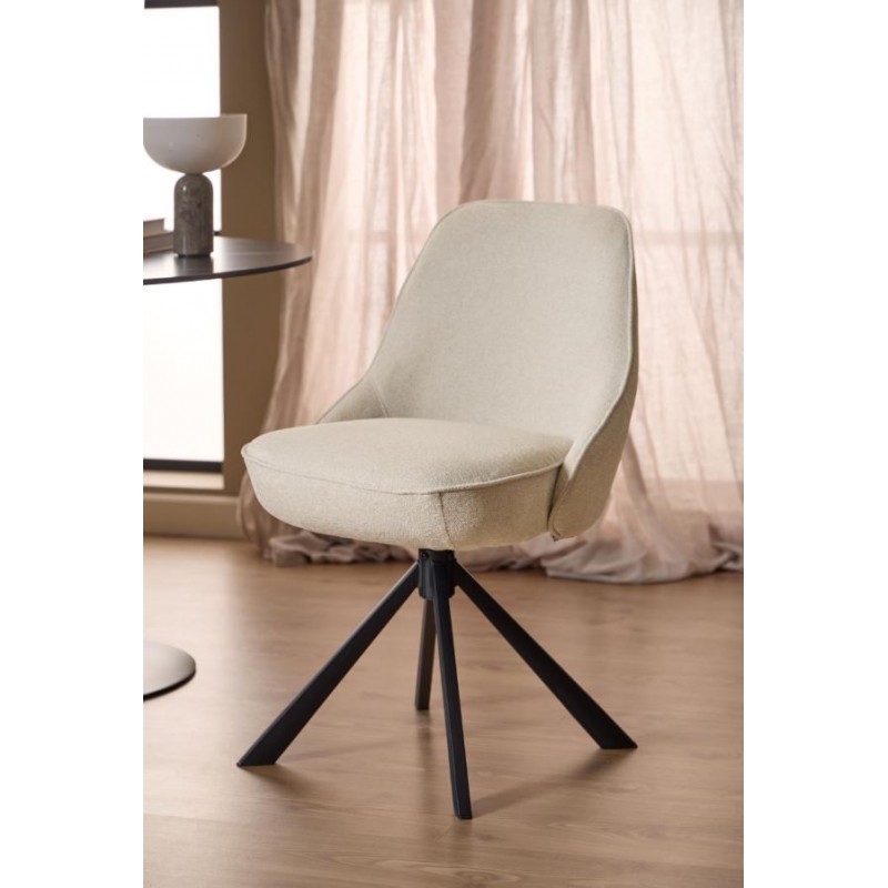 Dzięki zaokrąglonym liniom i subtelnym lamówkom, to krzesło do jadalni wyróżnia się przytulnym charakterem. Siedzisko wyposażone w sprężyny kieszeniowe zapewnia wyjątkowy komfort użytkowania, a tapicerka z beżowej strukturalnej tkaniny plecionej wyróżnia się miękkością i elegancją. Osadzone na czarnej, czteroramiennej stalowej podstawie, krzesło oferuje funkcję obrotową, umożliwiającą łatwe i płynne poruszanie się.