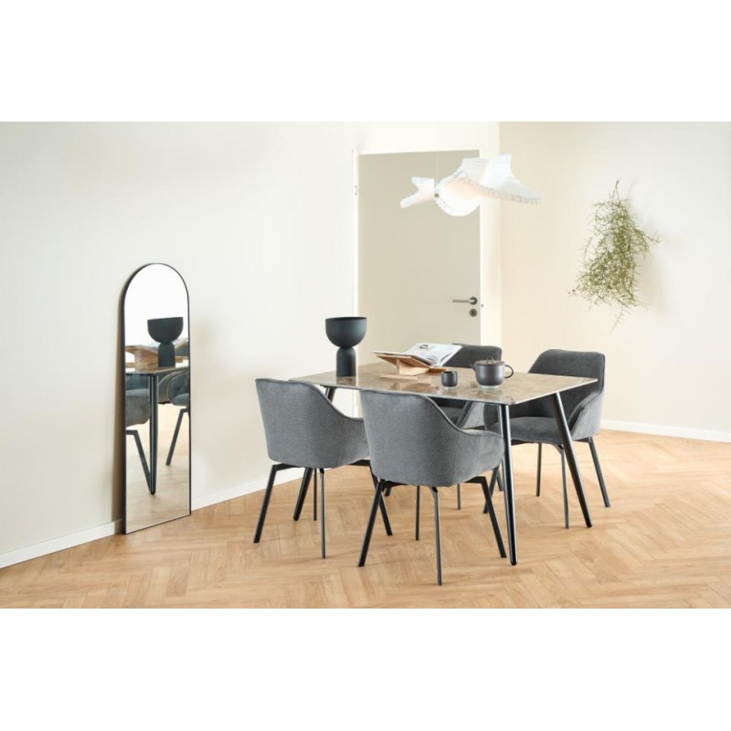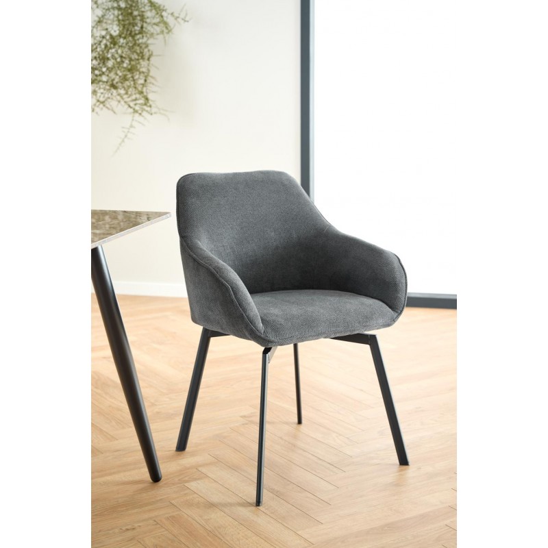 To antracytowe krzesło będzie idealnym uzupełnieniem, każdej nowoczesnej jadalni. Siedzisko otapicerowano miękką tkaniną o strukturze przypominającej szenilę w odcieniu szarości, która nadaje mu przytulny i elegancki charakter. Osadzone zostało na czarnej, stalowej podstawie obrotowej z funkcją automatycznego powrotu, krzesło doda wnętrzu elegancji i współczesnego charakteru.