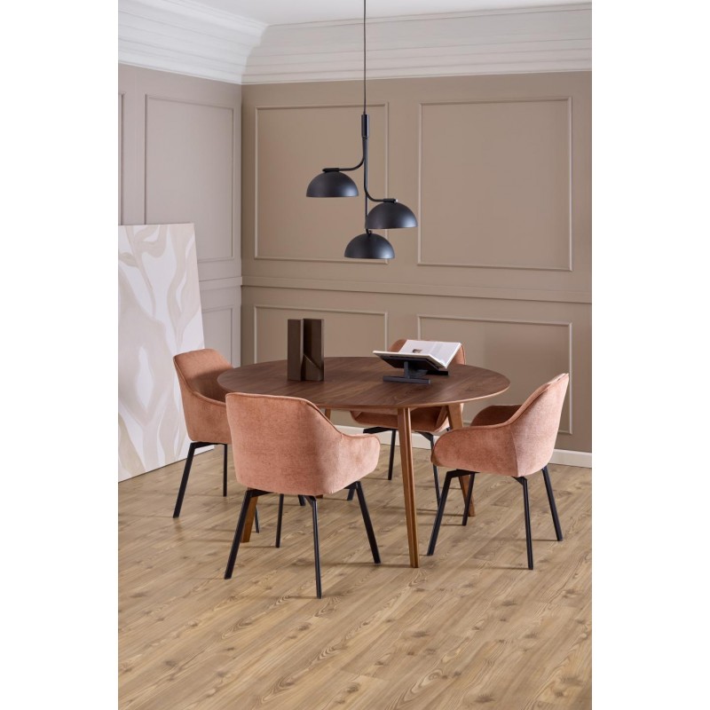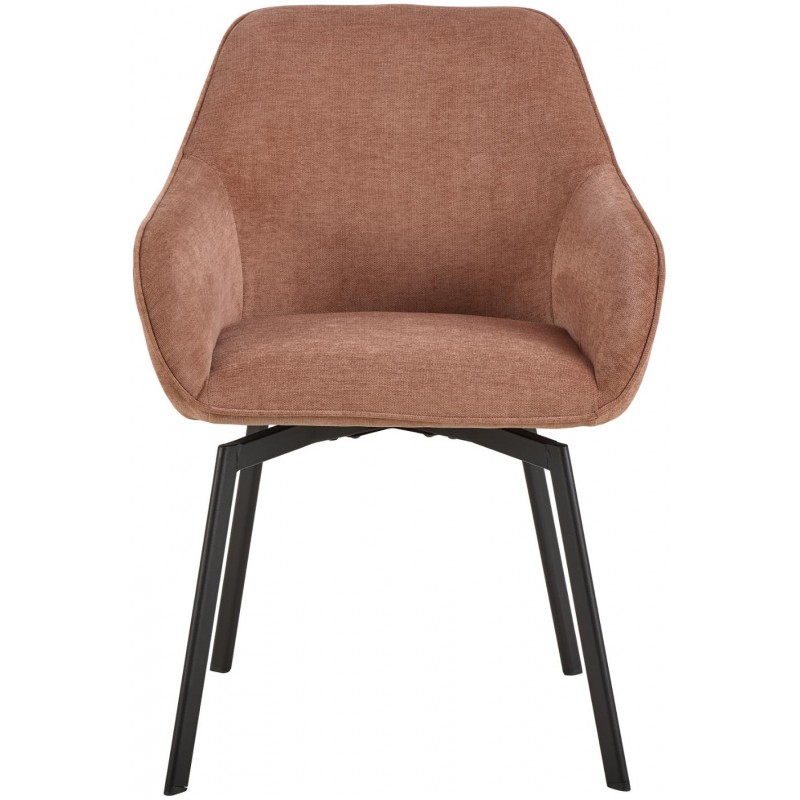 To krzesło z podłokietnikami stanowi doskonały dodatek do jadalni. Dzięki swojej budowie zapewnia wsparcie dla pleców, co sprawia, że jego użytkowanie będzie absolutną przyjemnością. Wsparte na czarnej, stalowej, obrotowej podstawie z funkcją automatycznego powrotu, krzesło wniesie nowoczesny akcent do Twojej przestrzeni. Siedzisko krzesła wykonane w pięknej tkaninie Danny w odcieniach brązu i pomarańczu w połączeniu z czarnymi metalowymi nogami tworzy niezwykle nowoczesny design.