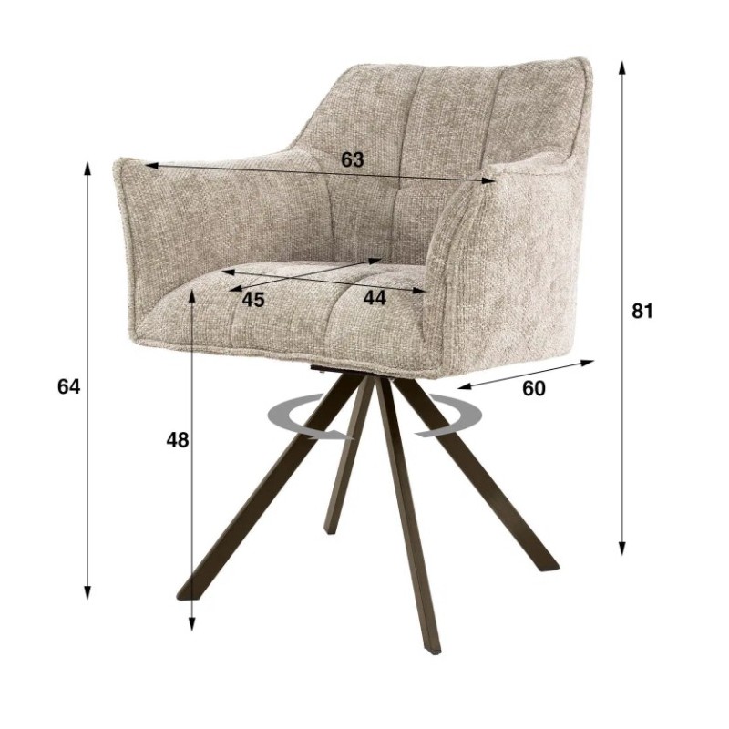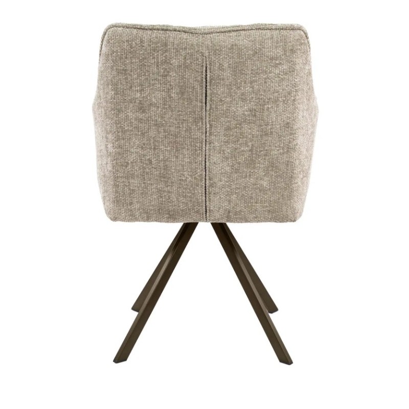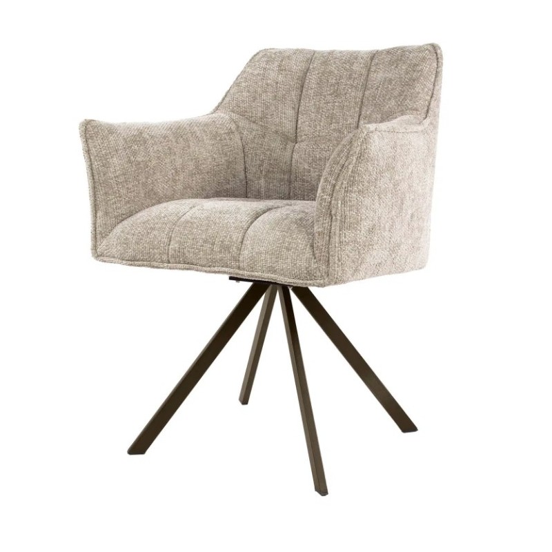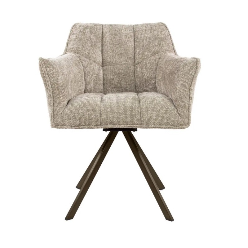 Nowoczesne krzesło obrotowe DORIS to mebel posiadający wiele korzyści w jednym produkcie, który bez wątpienia zachwyci swoim kształtem oraz starannym wykończeniem. Wygodne siedzisko, oparcie oraz podłokietniki utrzymane zostały w beżowym kolorze, która idealnie współgra z obrotową brązową metalową podstawą. Dodatkowym atutem tego krzesła bez wątpienia jest stylowy wygląd oraz jego kształty, które od razu podkreślają jego wyjątkowy charakter. Mebel ten posiada doskonale wyprofilowane oparcie z dekoracyjnymi poziomymi przeszyciami oraz siedzisko zaprojektowane w taki sposób aby odpowiednio wspierało sylwetkę siedzącego. Ponadto charakterystyczną jego cechą jest zastosowanie w nim sprężyn falistych typu nosag oraz bardzo modnych przeszyć wewnątrz siedziska, dzięki czemu efekt końcowy połączenia beżowego korpusu siedziska wraz z brązową podstawą jest fenomenalny nadający całości niezwykle wyjątkowego designu. Mebel ten wyróżnia się przede wszystkim swoją oryginalną formą oraz bardzo ciekawym wyglądem dzięki zastosowaniu na nim modnej plecionej tkaniny w odcieniach beżu. Takie połączenie kolorów to kompozycja, która idealnie sprawdzi się w jadalni oraz salonie urządzonych zarówno w stylu klasycznym jak również nowoczesnym dodając przestrzeni niezwykle oryginalnego charakteru.