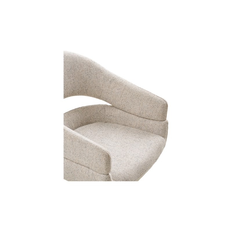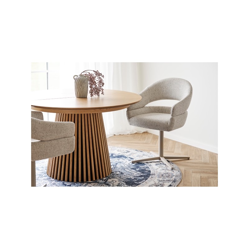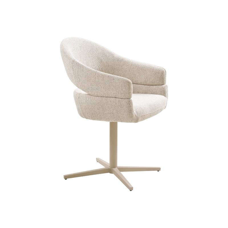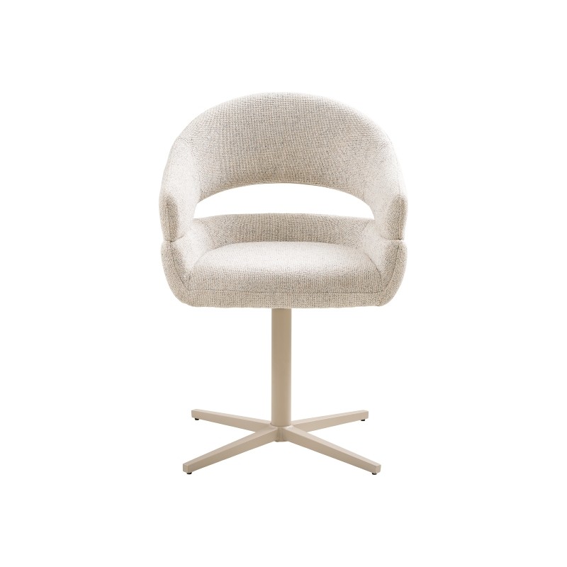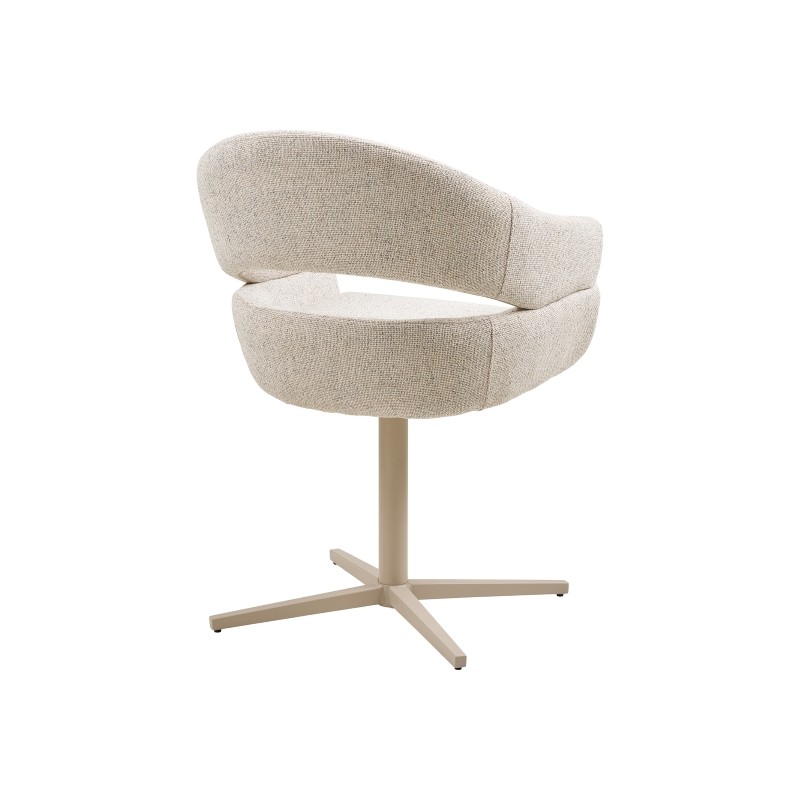 Krzesło osadzone jest na stabilnej, czteroramiennej podstawie, która umożliwia obrót siedziska — to praktyczne rozwiązanie ułatwia swobodne poruszanie się i wstawanie. Uniwersalna kolorystyka i subtelna forma sprawiają, że mebel z łatwością dopasuje się zarówno do nowoczesnych, jak i klasycznych aranżacji jadalni, kuchni czy salonu, wprowadzając do wnętrza lekkość i wysmakowany styl.