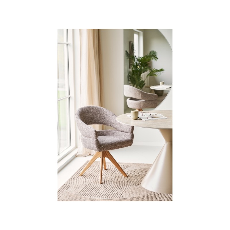 Krzesło osadzone jest na stabilnej, czteroramiennej podstawie, która umożliwia obrót siedziska — to praktyczne rozwiązanie ułatwia swobodne poruszanie się i wstawanie. Uniwersalna kolorystyka i subtelna forma sprawiają, że mebel z łatwością dopasuje się zarówno do nowoczesnych, jak i klasycznych aranżacji jadalni, kuchni czy salonu, wprowadzając do wnętrza lekkość i wysmakowany styl.