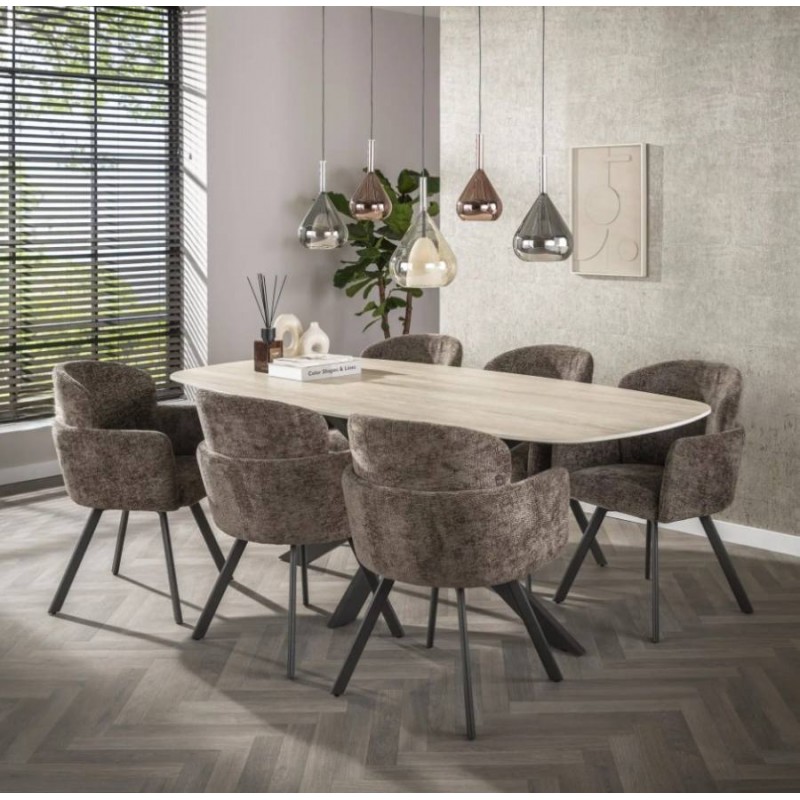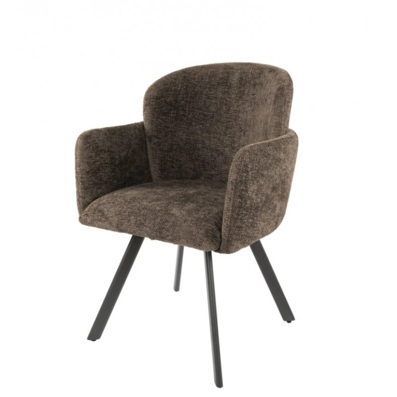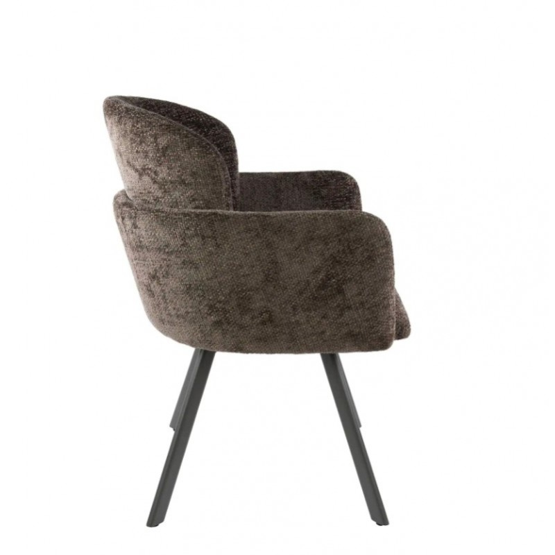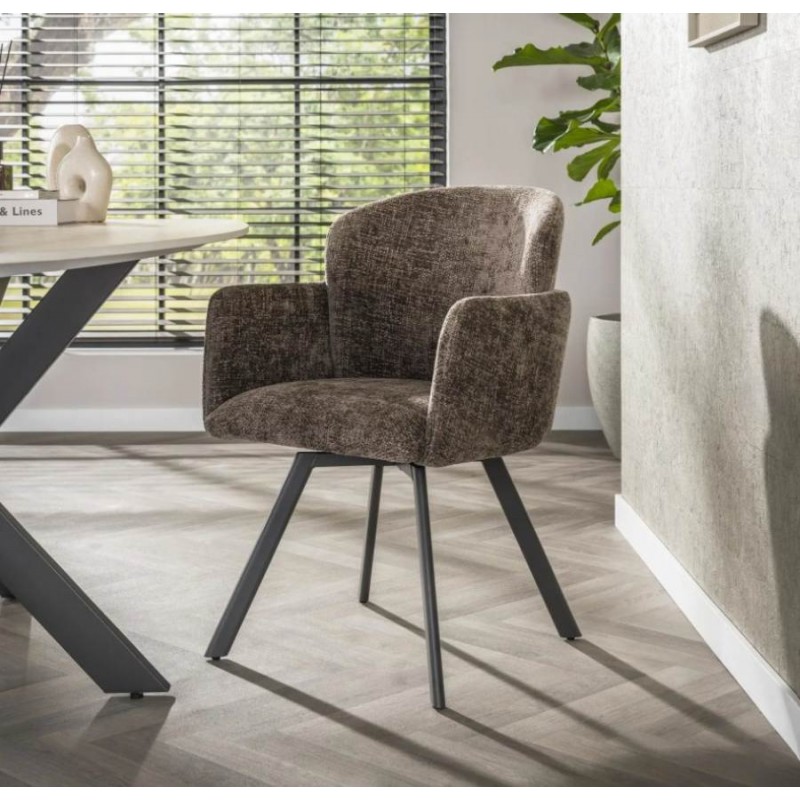 Nowoczesne krzesło DURU to mebel posiadający wiele korzyści w jednym produkcie, który bez wątpienia zachwyci swoim kształtem oraz starannym wykończeniem. Wygodne siedzisko, oparcie oraz podłokietniki utrzymane zostały w brązowej tonacji, która idealnie współgra z obrotową ciemną metalową podstawą. Dodatkowym atutem tego krzesła bez wątpienia zarówno zastosowanie w nim sprężyn kieszeniowych typu pocket jego stylowy wygląd oraz zaokrąglone kształty, które od razu podkreślają jego wyjątkowy charakter. Mebel ten posiada doskonale wyprofilowane oparcie oraz siedzisko zaprojektowane w taki sposób aby odpowiednio wspierało sylwetkę siedzącego. Ponadto charakterystyczną jego cechą jest zastosowanie bardzo modnych i zarazem oryginalnych krzywizn na oparciu oraz podłokietnikach, dzięki czemu efekt końcowy połączenia brązowego korpusu siedziska wraz z metalowa podstawą jest fenomenalny nadając całości niezwykle wyjątkowy design. Mebel ten wyróżnia się przede wszystkim swoją oryginalną formą oraz bardzo ciekawym wyglądem dzięki zastosowaniu na nim modnej strukturalnej tkaniny w kolorze brązowym o gramaturze plecionej. Takie połączenie kolorów to kompozycja, która idealnie sprawdzi się w jadalni oraz salonie urządzonych zarówno w stylu industrialnym jak również nowoczesnym dodając przestrzeni niezwykle oryginalnego charakteru.