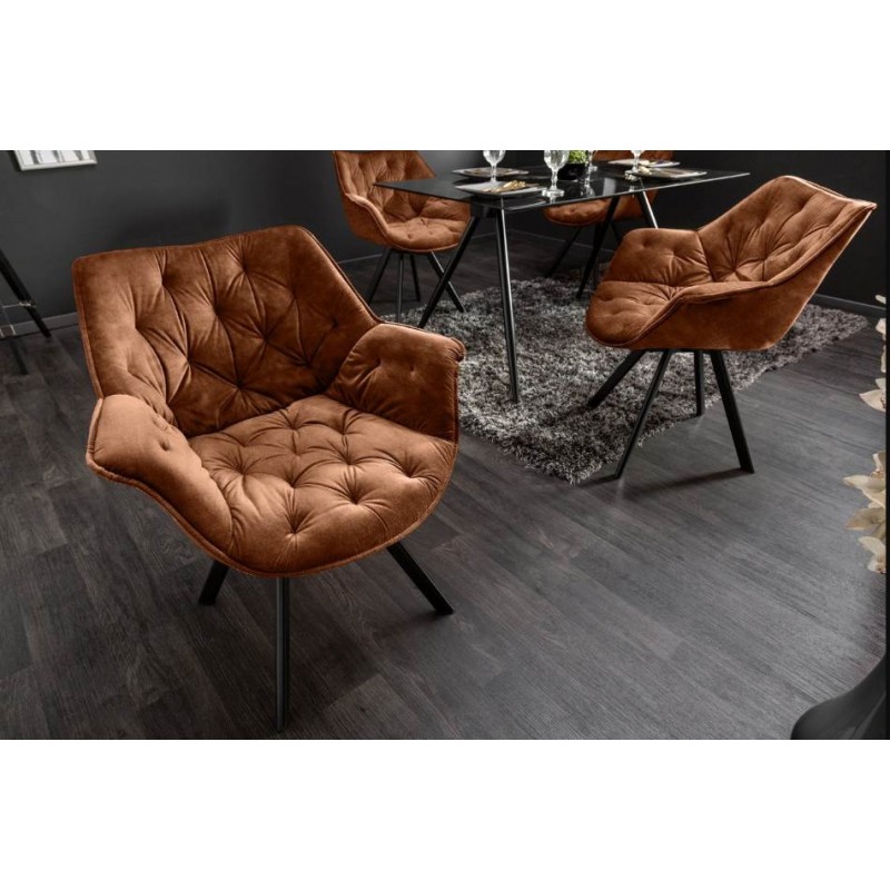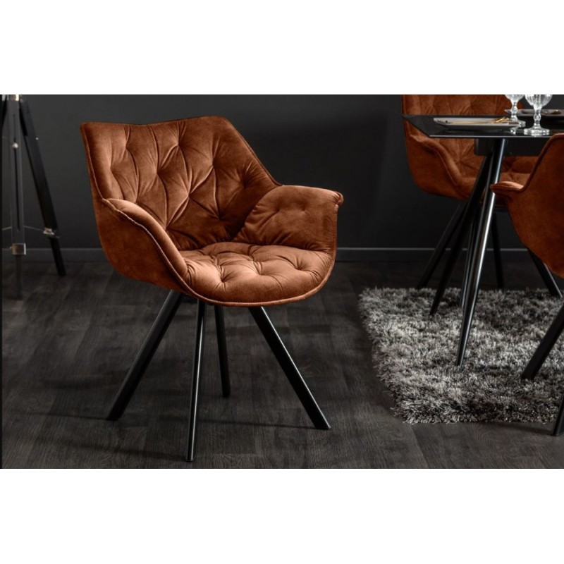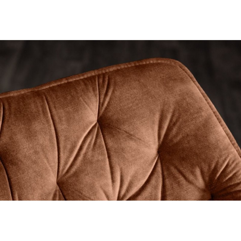 Komfortowe krzesło tapicerowane DUTCH to bez wątpienia połączenie stylu i elegancji. Wykonany został z wysokiej jakości aksamitnego materiału w odcieniu brązowym przez co prezentuje się zjawiskowo dodając tym samym wyjątkowego stylu każdemu wnętrzu. Ważnym elementem mebla jest wyprofilowane oparcie oraz siedzisko, które odpowiednio wspierają sylwetkę siedzącego podczas długich godzin pracy. Oryginalne krzywizny oparcia, wygodne siedzisko, funkcja obrotu oraz smukła czarna metalowa podstawa nadają mu wyjątkowy design, a dzięki zastosowaniu aksamitnej tkaniny zwiększa komfort użytkowania. Dodatkowym atutem tego krzesła bez wątpienia są stylowe eleganckie pikowania zastosowane wewnątrz siedziska, dzięki czemu całość korpusu podkreśla jego charakter. Krzesło to stworzone zostało głównie z myślą o użytkownikach ceniących sobie funkcjonalność oraz stylowe wykończenie. Efekt końcowy połączenia tkaniny w odcieniu brązu oraz czarnej metalowej podstawy jest fenomenalny, dzięki czemu idealnie sprawdzi się w jadalni oraz salonie urządzonym w stylu klasycznym oraz nowoczesnym.
