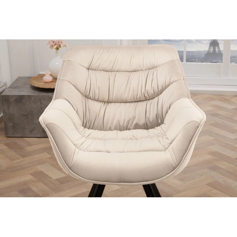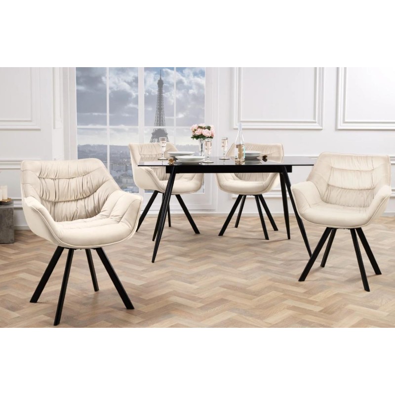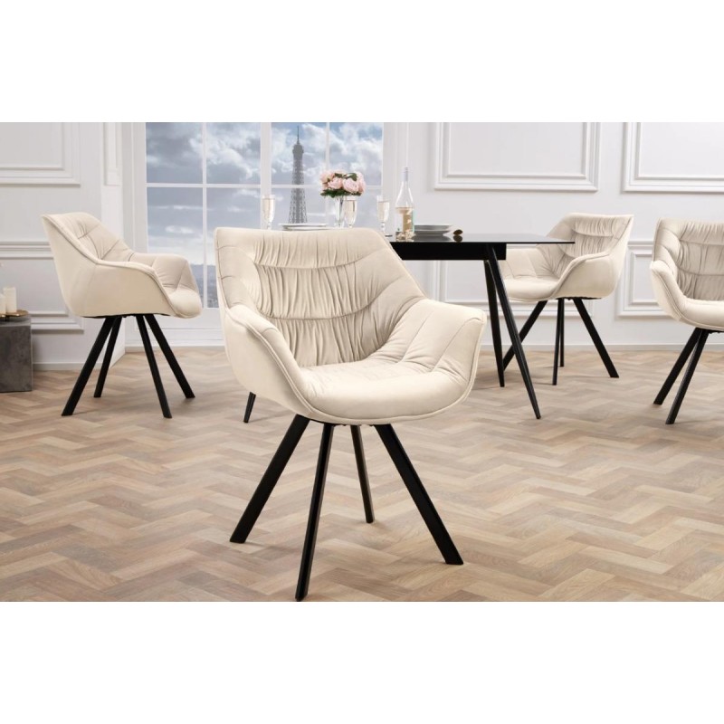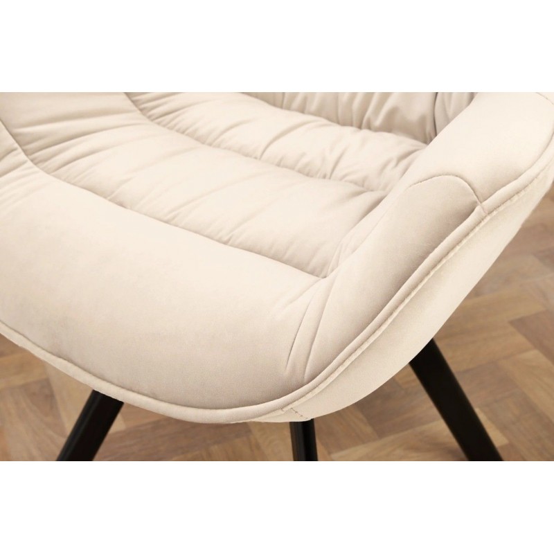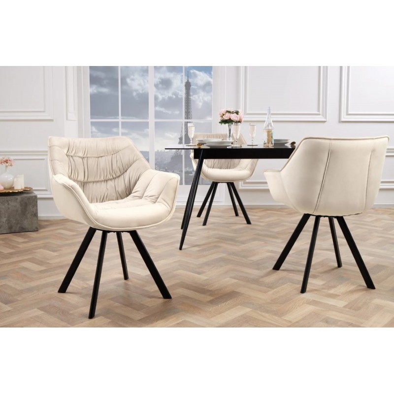 Komfortowe krzesło tapicerowane DUTCH to bez wątpienia połączenie stylu i elegancji. Wykonany został z wysokiej jakości modnego aksamitnego materiału w kolorze beżowym przez co prezentuje się zjawiskowo dodając tym samym wyjątkowego stylu każdemu wnętrzu. Ważnym elementem mebla jest wyprofilowany korpus, który odpowiednio wspiera sylwetkę siedzącego podczas jego użytkowania. Oryginalne krzywizny oparcia, wygodne siedzisko, funkcja obrotu oraz smukła czarna metalowa podstawa nadają mu wyjątkowy design, a dzięki zastosowaniu aksamitnej tkaniny zwiększa komfort użytkowania. Dodatkowym atutem tego krzesła bez wątpienia są dekoracyjne stylowe poziome przeszycia zastosowane wewnątrz siedziska, dzięki czemu całość odkreśla jego charakter. Krzesło to stworzone zostało głównie z myślą o użytkownikach ceniących sobie funkcjonalność oraz stylowe wykończenie. Efekt końcowy połączenia tkaniny w odcieniu beżu oraz czarnej metalowej podstawy jest fenomenalny, dzięki czemu idealnie sprawdzi się w jadalni oraz salonie urządzonym w stylu klasycznym oraz nowoczesnym.