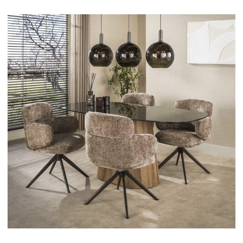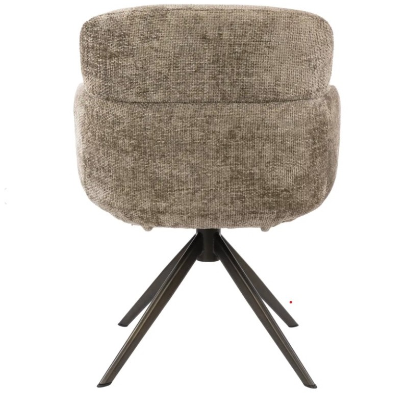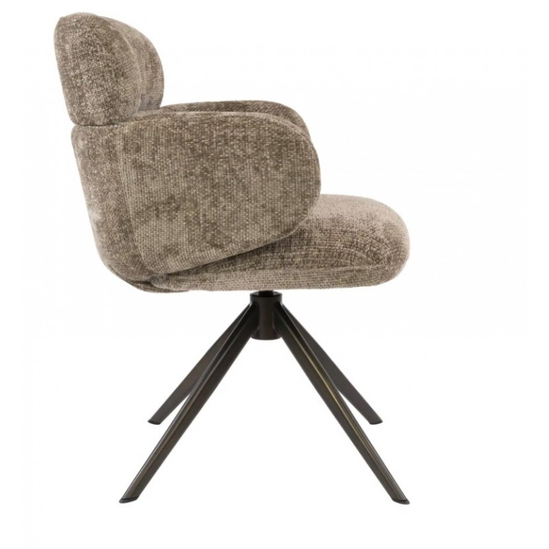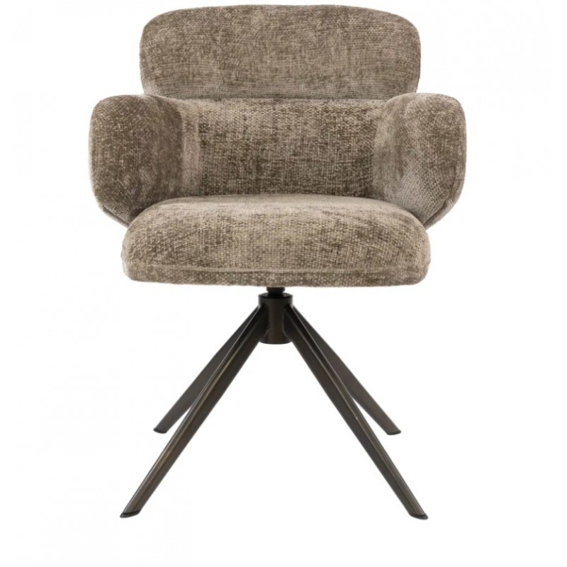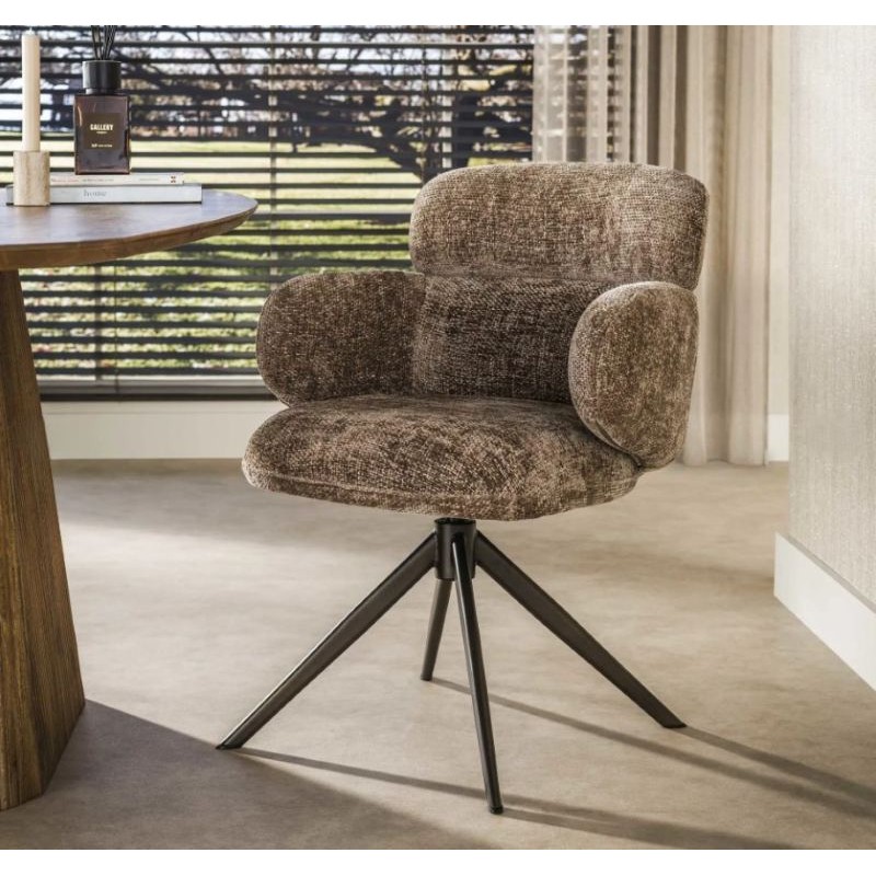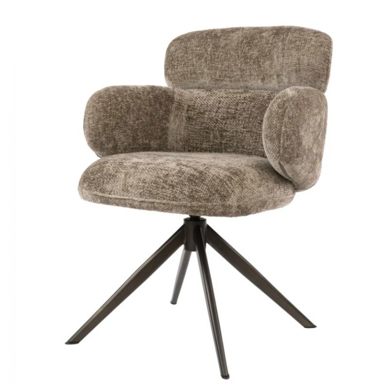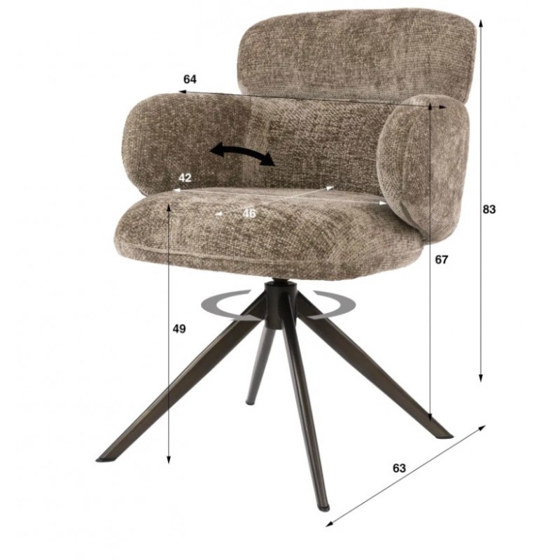 Nowoczesne krzesło HERB to mebel posiadający wiele korzyści w jednym produkcie, który bez wątpienia zachwyci swoim kształtem oraz starannym wykończeniem. Mebel ten wyróżnia się przede wszystkim swoją oryginalną formą oraz bardzo ciekawym wyglądem dzięki zastosowaniu na nim modnej strukturalnej tkaniny w kolorze taupe o brązowym odcieniu i plecionej gramaturze. Wygodne siedzisko, podłokietniki oraz oparcie utrzymane w jednej tonacji idealnie współgrają z obrotową brązową podstawą. Niewątpliwym atutem krzesła jest zastosowanie sprężyn kieszeniowych typu pocket, jak również stylowy wygląd oraz subtelnie zaokrąglone kształty, podkreślające jego wyjątkowy charakter. Mebel ten posiada doskonale wyprofilowane oparcie oraz siedzisko zaprojektowane w taki sposób aby odpowiednio wspierało sylwetkę siedzącego. Ponadto charakterystyczną jego cechą jest zastosowanie bardzo modnych i zarazem oryginalnych krzywizn na oparciu oraz podłokietnikach nadający całości niezwykle wyjątkowego designu. Takie połączenie kolorów to kompozycja, która idealnie sprawdzi się w jadalni oraz salonie urządzonych w stylu nowoczesnym dodając przestrzeni niezwykle oryginalnego charakteru.
