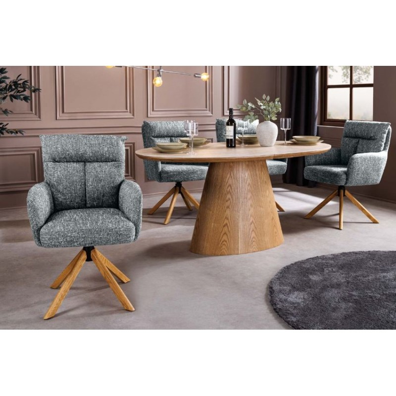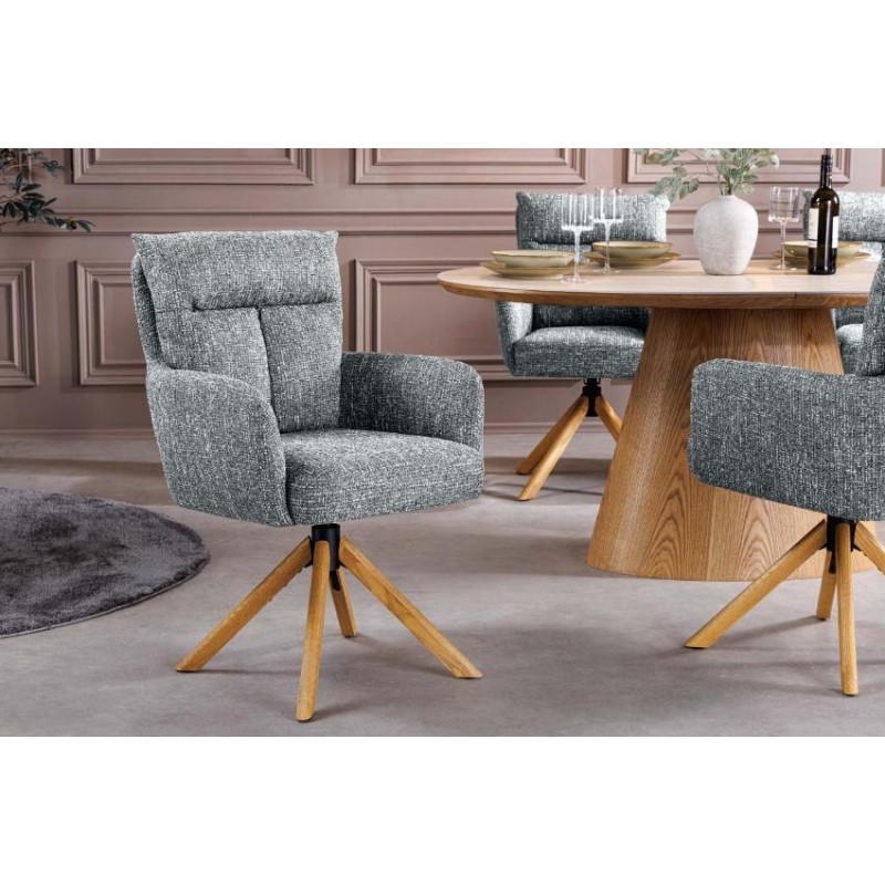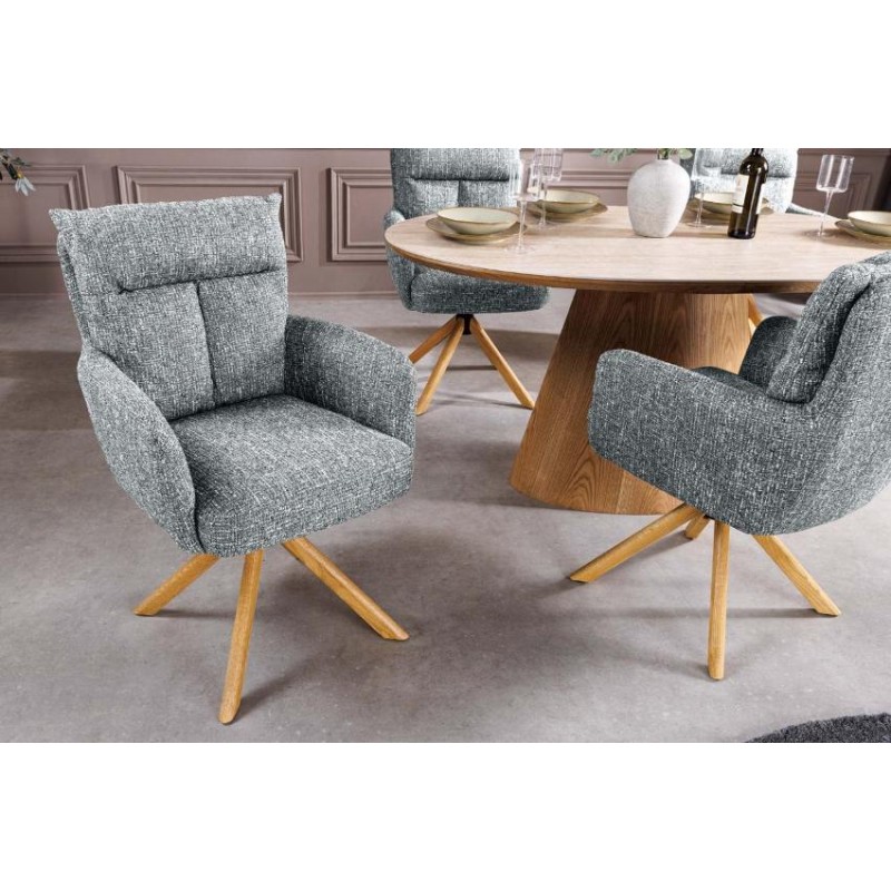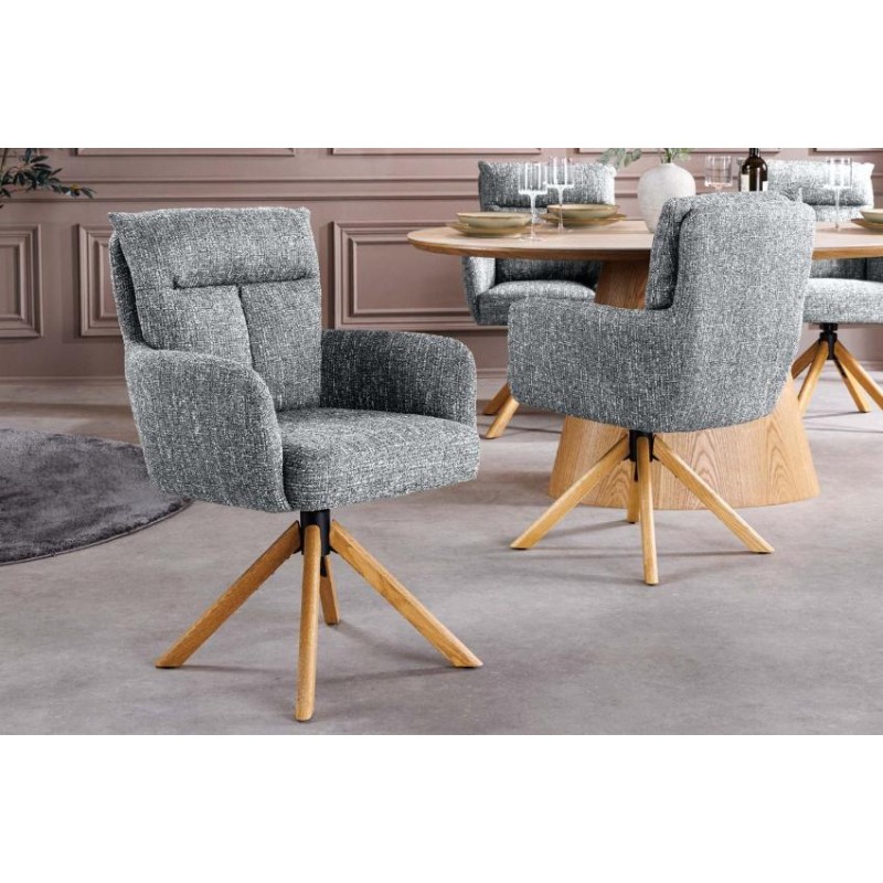 KRZESŁO OBROTOWE GRAHAM CIEMNOSZARE Dostępne od ręki - 1 sztuka To krzesło do jadalni o eleganckiej i wyrafinowanej sylwetce przyciąga uwagę i podkreśla charakter wnętrza. Siedzisko otapicerowane zostało ciemnoszarą, teksturowaną tkaniną plecioną z subtelnym, dekoracyjnym wycięciem na oparciu, łączącym komfort z nowoczesnym designem. Krzesło osadzono na...