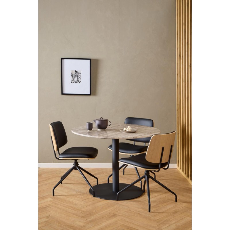 Krzesło do jadalni bez wątpienia łączy klasyczną formę z nowoczesnym charakterem. Siedzisko i oparcie wykonano z giętego, lakierowanego dębowego forniru, który dodaje wnętrzu ciepła, wspierane eleganckimi czarnymi metalowymi elementami. Komfort zapewnia warstwa pianki i tapicerka z czarnej ekoskóry, a czarna metalowa czteroramienna podstawa obrotowa umożliwia swobodne przesuwanie krzesła.