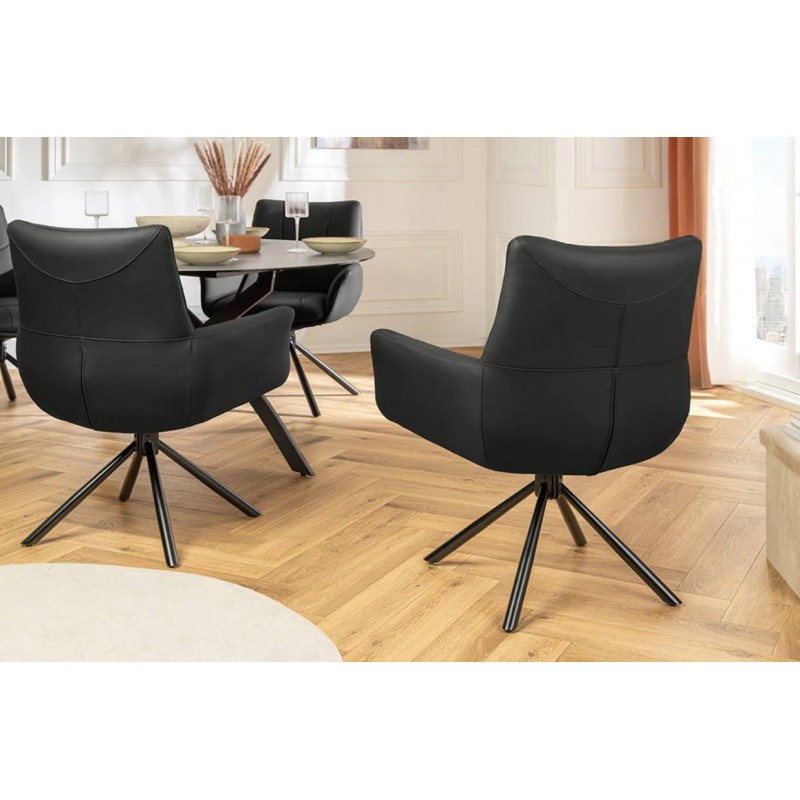 Nowoczesne krzesło SIGNATURE to funkcjonalne i stylowe rozwiązanie, które doskonale odnajdzie się zarówno w eleganckiej jadalni, jak i w salonie. Jego siedzisko wykonano z wysokiej jakości naturalnej skóry w modnym czarnym kolorze, wyróżniając się pięknym i starannym wykończeniem wewnątrz mebla. Ozdobne przeszycia i stylowe pikowania nadają mu wyjątkowej elegancji, czyniąc go prawdziwą ozdobą każdego wnętrza. Stabilna, metalowa podstawa w czarnym kolorze umożliwia obrót o 360°, co dodatkowo podkreśla praktyczny jego charakter. Nowoczesny design podkreślają oryginalne linie, subtelne zdobienia oraz smukła czarna podstawa, która harmonijnie łączy wygodne siedzisko oraz odpowiednio wyprofilowane oparcie. Krzesło SIGNATURE, zostało wykonane z materiałów najwyższej jakości, zapewniając przy tym wyjątkowy komfort siedzenia oraz ekskluzywny wygląd. Dzięki ergonomicznemu oparciu i siedzisku doskonale wspiera sylwetkę podczas jego użytkowania. Model ten idealnie wpasuje się w nowoczesne aranżacje, dodając pomieszczeniom nie tylko elegancji i funkcjonalności, ale także odrobinę luksusu.