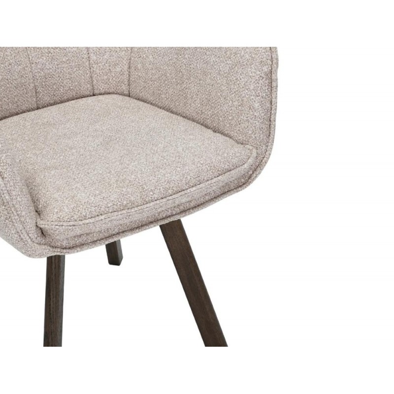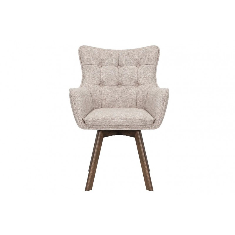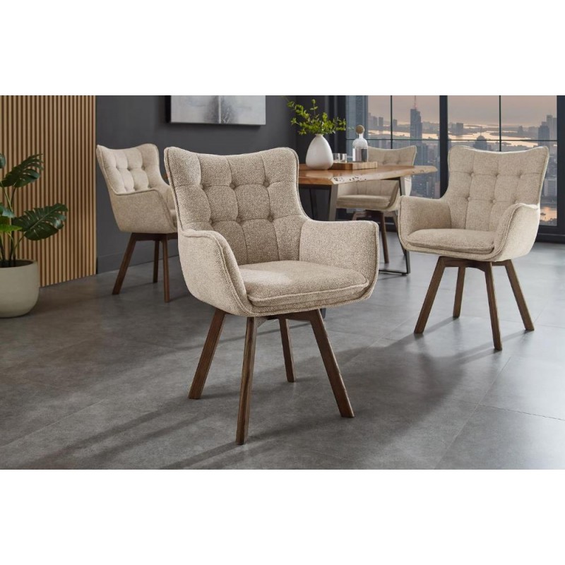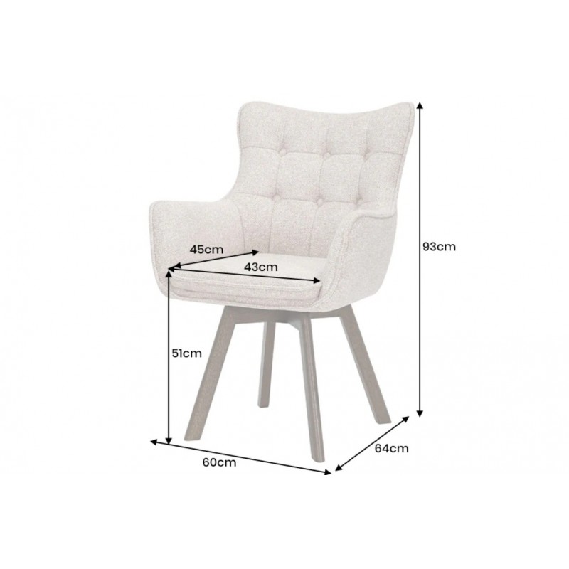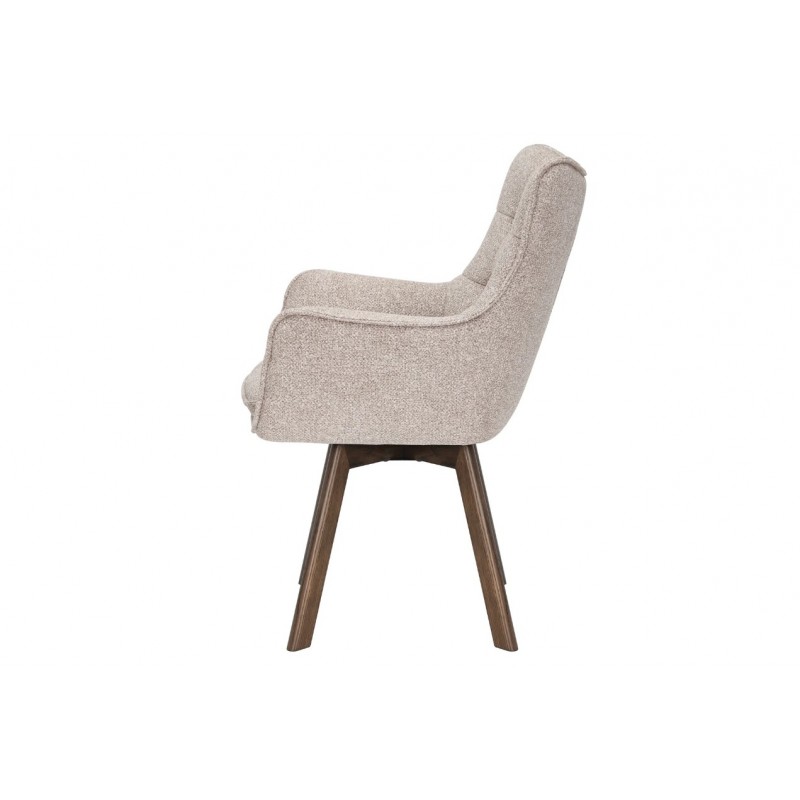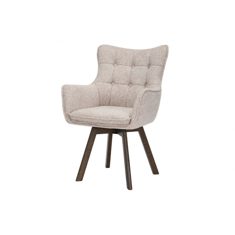 Krzesło THOR to idealne rozwiązanie do każdego wnętrza w stylu klasycznym oraz nowoczesnym. Mebel ten dzięki swojej niesamowitej strukturze oraz formie nie tylko przykuje uwagę każdego, a także doda przestrzeni niezwykłej elegancji. Posiada doskonale wyprofilowane oparcie oraz siedzisko zaprojektowane w taki sposób aby odpowiednio wspierało sylwetkę siedzącego podczas jego użytkowania. Dodatkowym atutem tego krzesła jest jego wygląd oraz zaokrąglone kształty, które od razu podkreślają jego wyjątkowy styl. Ponadto charakterystyczną jego cechą jest zastosowanie w nim, bardzo modnych i zarazem oryginalnych krzywizn, eleganckich przeszyć oraz pikowań w formie guzików na jego oparciu. Efekt końcowy połączenia beżowego koloru na korpusie siedziska wraz z obrotową ciemną drewnianą dębową podstawą nadaje całości wyjątkowego designu. Mebel ten wyróżnia się przede wszystkim swoją oryginalną formą oraz bardzo ciekawym wyglądem poprzez zastosowaniu na nim modnej teksturowanej plecionej tkaniny w odcieniu beżowym. Takie połączenie kolorów sprawia, że idealnie odnajdzie się w jadalni oraz salonie urządzonych zarówno w stylu klasycznym jak i nowoczesnym dodając przestrzeni niezwykle oryginalnego charakteru.