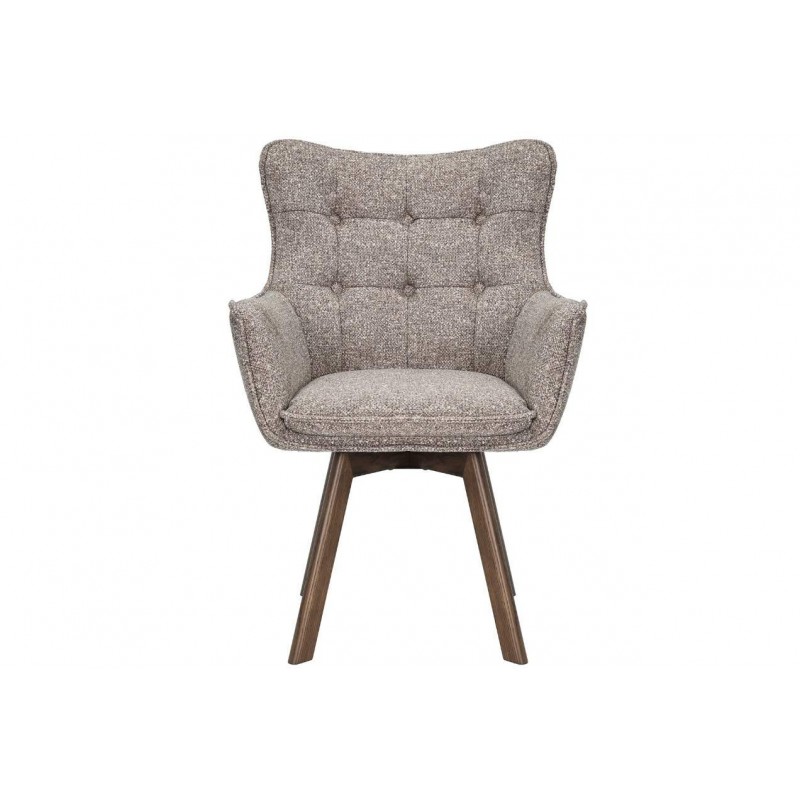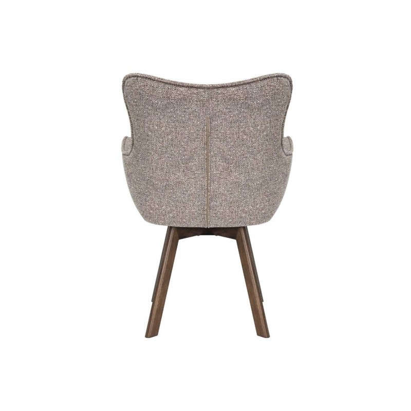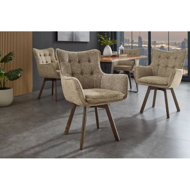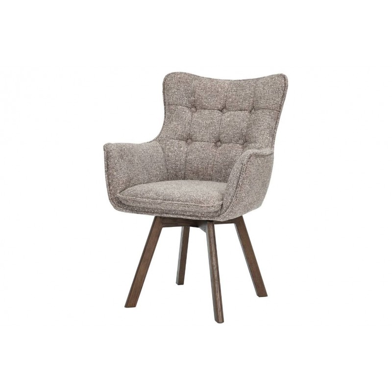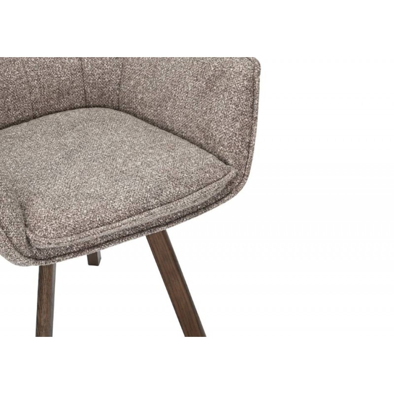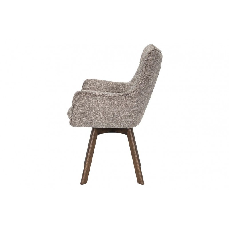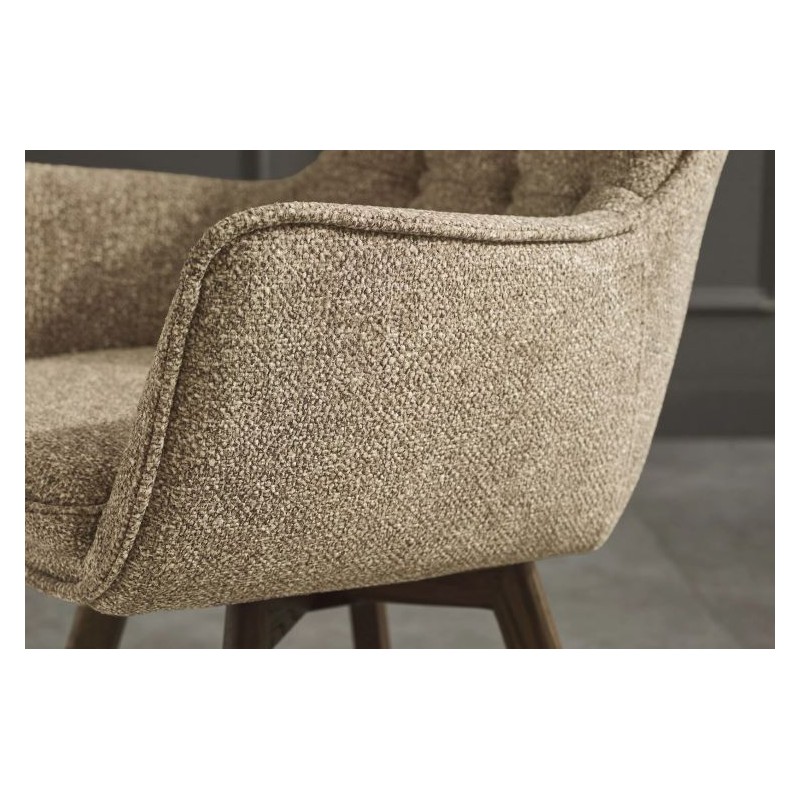 Krzesło THOR to idealne rozwiązanie do każdego wnętrza w stylu klasycznym oraz nowoczesnym. Mebel ten dzięki swojej niesamowitej strukturze oraz formie nie tylko przykuje uwagę każdego, a także doda przestrzeni niezwykłej elegancji. Posiada doskonale wyprofilowane oparcie oraz siedzisko zaprojektowane w taki sposób aby odpowiednio wspierało sylwetkę siedzącego podczas jego użytkowania. Dodatkowym atutem tego krzesła jest jego wygląd oraz zaokrąglone kształty, które od razu podkreślają jego wyjątkowy styl. Ponadto charakterystyczną jego cechą jest zastosowanie w nim, bardzo modnych i zarazem oryginalnych krzywizn, eleganckich przeszyć oraz pikowań w formie guzików na jego oparciu. Efekt końcowy połączenia koloru taupe na korpusie siedziska wraz z obrotową ciemną drewnianą dębową podstawą nadaje całości wyjątkowego designu. Mebel ten wyróżnia się przede wszystkim swoją oryginalną formą oraz bardzo ciekawym wyglądem poprzez zastosowaniu na nim modnej teksturowanej plecionej tkaniny w odcieniu brązowym. Takie połączenie kolorów sprawia, że idealnie odnajdzie się w jadalni oraz salonie urządzonych zarówno w stylu klasycznym jak i nowoczesnym dodając przestrzeni niezwykle oryginalnego charakteru.