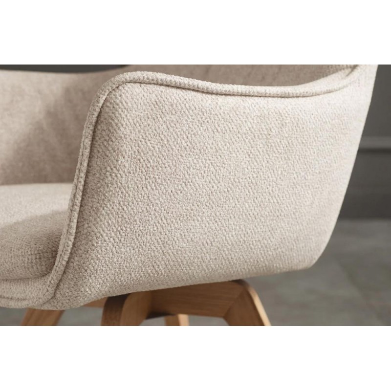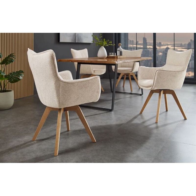 Nowoczesne krzesło VOGUE z designerskim oparciem i siedziskiem to połączenie wielu zalet w jednym produkcie, który z pewnością zachwyci dopracowanym wykończeniem. Komfortowe, zaokrąglone siedzisko w kolorze beżowym idealnie współgra z drewnianą podstawą, tworząc spójną i elegancką całość. Mebel ten wyróżnia się nie tylko swoją oryginalną formą, ale również bardzo ciekawym wyglądem, dzięki zastosowaniu na nim dekoracyjnych przeszyć oraz modnej teksturowanej tkaniny, której wyjątkowy charakter podkreśla gramatura strukturalnej tapicerki. Oparcie krzesła zostało starannie wyprofilowane, aby zapewnić ergonomiczne podparcie pleców i odciążyć sylwetkę podczas siedzenia, natomiast obrotowa podstawa zwiększa wygodę użytkowania, zwłaszcza przy stole czy biurku. Krzesło VOGUE to nie tylko funkcjonalny mebel, ale także stylowy akcent wnętrza, który wprowadza nowoczesny klimat. Połączenie modnego koloru w odcieniach beżu z naturalnym drewnem doskonale sprawdza się w nowoczesnych aranżacjach, dodając przestrzeni elegancji i oryginalnego charakteru.