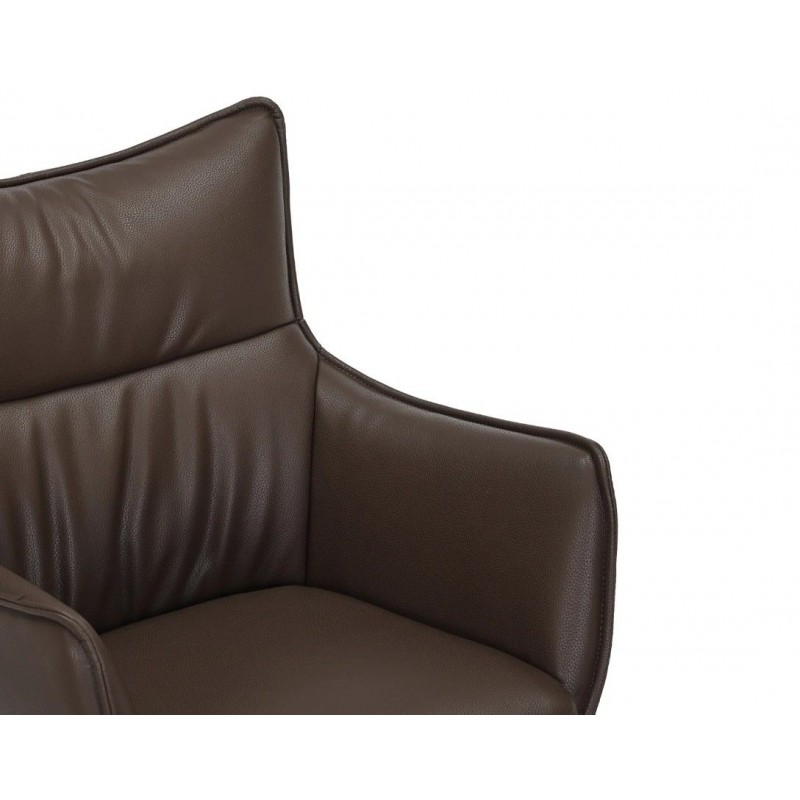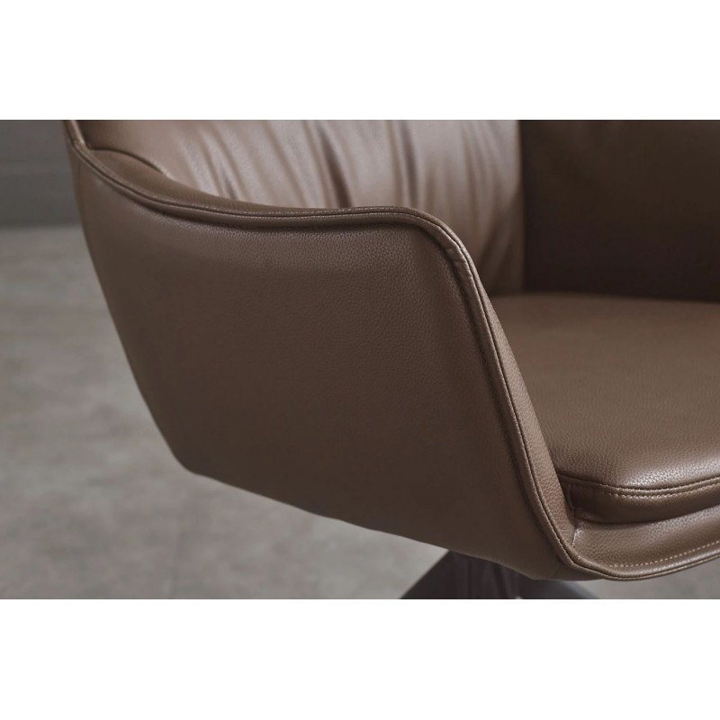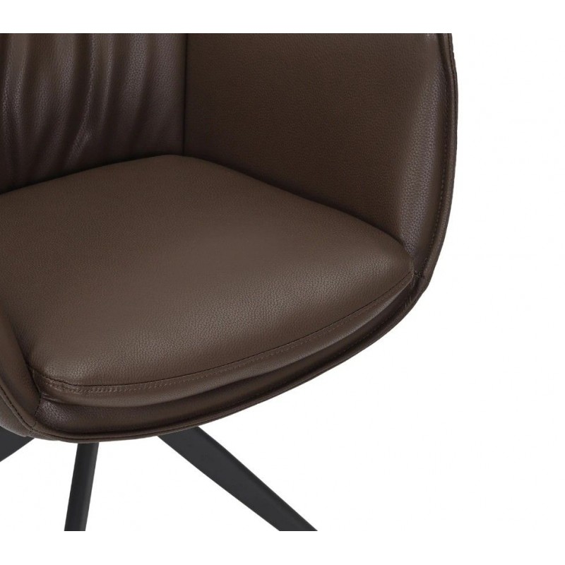 Nowoczesne krzesło VOGUE z designerskim oparciem i siedziskiem to połączenie wielu zalet w jednym produkcie, który z pewnością zachwyci dopracowanym wykończeniem. Komfortowe, zaokrąglone siedzisko w odcieniach brązu idealnie współgra metalową podstawą, tworząc spójną i elegancką całość. Mebel ten wyróżnia się nie tylko swoją oryginalną formą, ale również bardzo ciekawym wyglądem, dzięki zastosowaniu na nim dekoracyjnych przeszyć oraz modnej ekoskóry, której wyjątkowy charakter podkreśla gramatura tapicerki. Oparcie krzesła zostało starannie wyprofilowane, aby zapewnić ergonomiczne podparcie pleców i odciążyć sylwetkę podczas siedzenia, natomiast obrotowa podstawa zwiększa wygodę użytkowania, zwłaszcza przy stole czy biurku. Krzesło VOGUE to nie tylko funkcjonalny i wygodny element wyposażenia, ale także stylowa dekoracja, wprowadzająca do wnętrza odrobinę nowoczesnej elegancji i oryginalności.