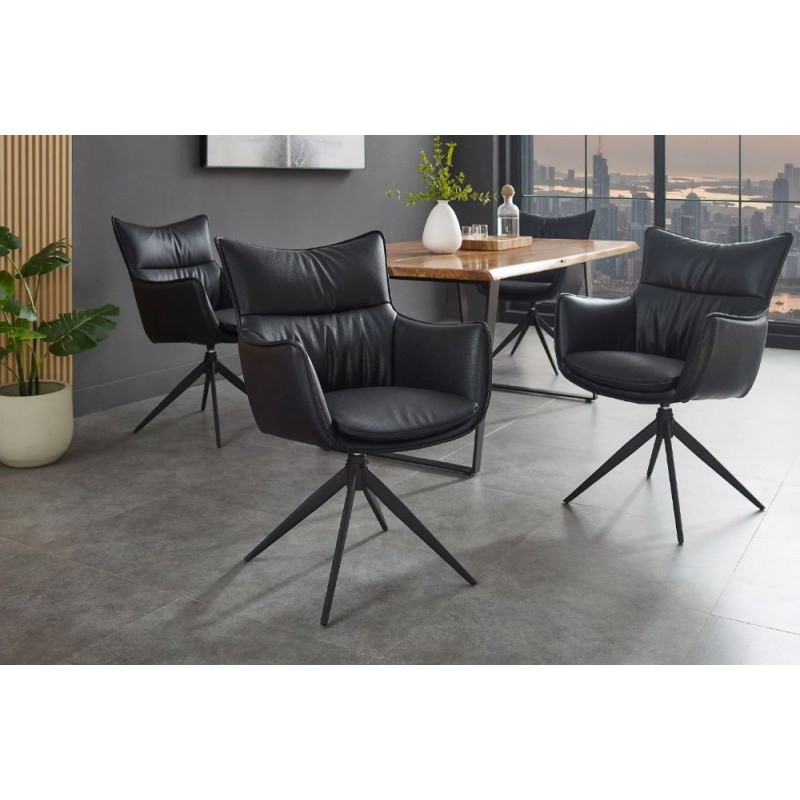 KRZESŁO OBROTOWE GRAHAM CIEMNOSZARE Dostępne od ręki - 1 sztuka To krzesło do jadalni o eleganckiej i wyrafinowanej sylwetce przyciąga uwagę i podkreśla charakter wnętrza. Siedzisko otapicerowane zostało ciemnoszarą, teksturowaną tkaniną plecioną z subtelnym, dekoracyjnym wycięciem na oparciu, łączącym komfort z nowoczesnym designem. Krzesło osadzono na...