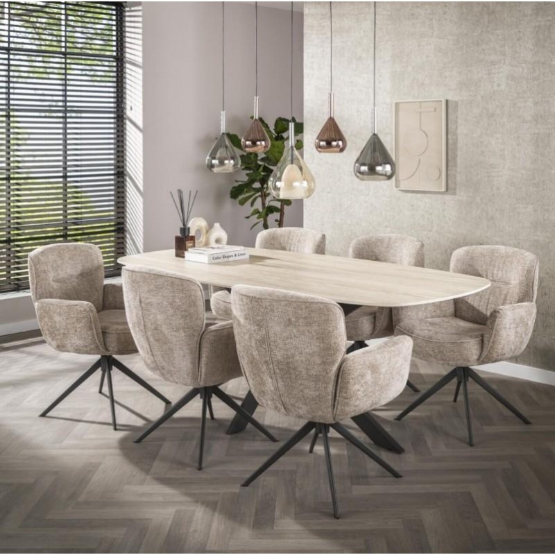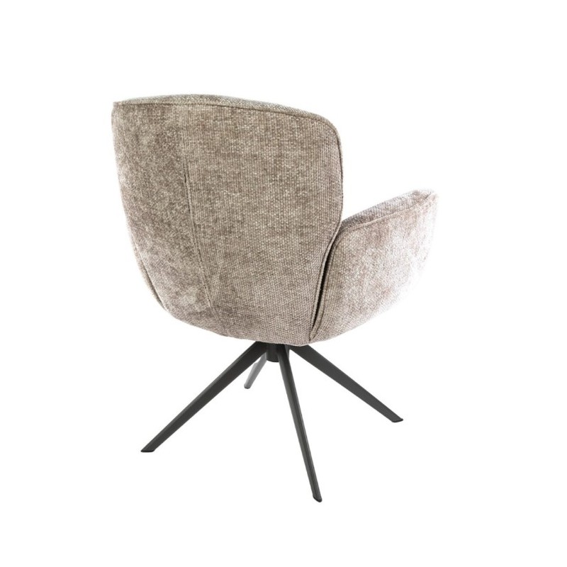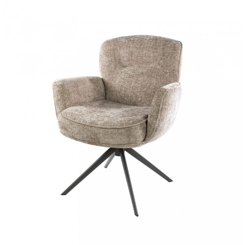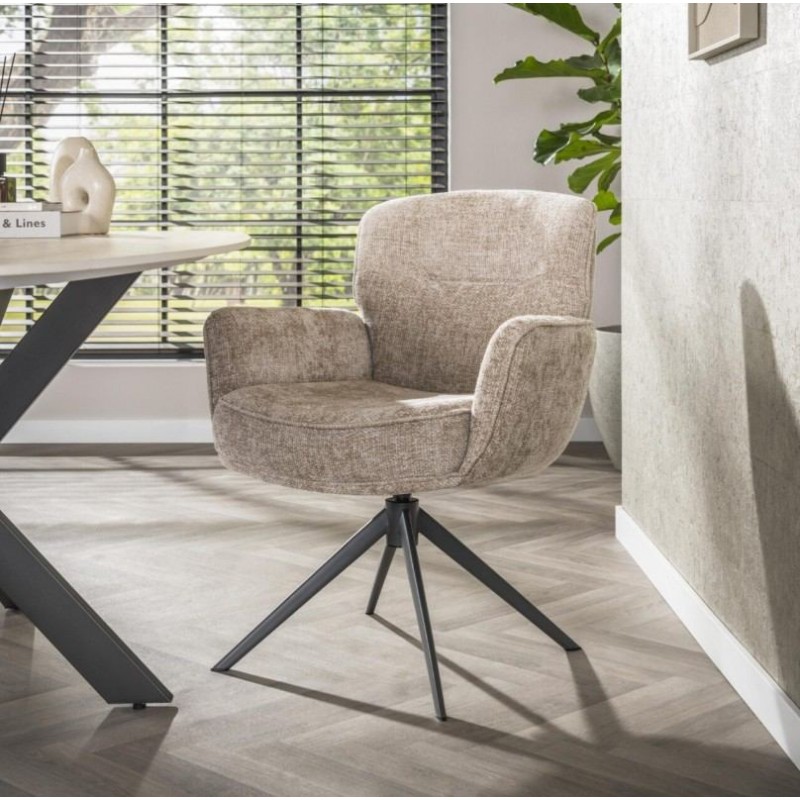 Nowoczesne krzesło XAVIER to mebel posiadający wiele korzyści w jednym produkcie, który bez wątpienia zachwyci swoim kształtem oraz starannym wykończeniem. Wygodne siedzisko, podłokietniki oraz oparcie utrzymane w beżowej tonacji idealnie współgra z obrotową ciemną metalową podstawą. Niewątpliwym atutem krzesła jest zastosowanie sprężyn kieszeniowych typu pocket, jak również stylowy wygląd oraz subtelnie zaokrąglone kształty, podkreślające jego wyjątkowy charakter. Mebel ten posiada doskonale wyprofilowane oparcie oraz siedzisko zaprojektowane w taki sposób aby odpowiednio wspierało sylwetkę siedzącego. Ponadto charakterystyczną jego cechą jest zastosowanie bardzo modnych i zarazem oryginalnych krzywizn na oparciu oraz podłokietnikach, dzięki czemu efekt końcowy połączenia beżowego korpusu siedziska wraz z metalowa podstawą jest fenomenalny nadając całości niezwykle wyjątkowy design. Mebel ten wyróżnia się przede wszystkim swoją oryginalną formą oraz bardzo ciekawym wyglądem dzięki zastosowaniu na nim modnej strukturalnej szenilowej tkaniny w kolorze beżowym o gramaturze plecionej. Takie połączenie kolorów to kompozycja, która idealnie sprawdzi się w jadalni oraz salonie urządzonych w stylu nowoczesnym dodając przestrzeni niezwykle oryginalnego charakteru.