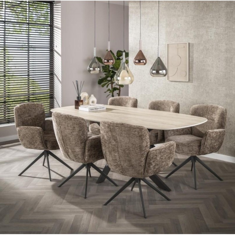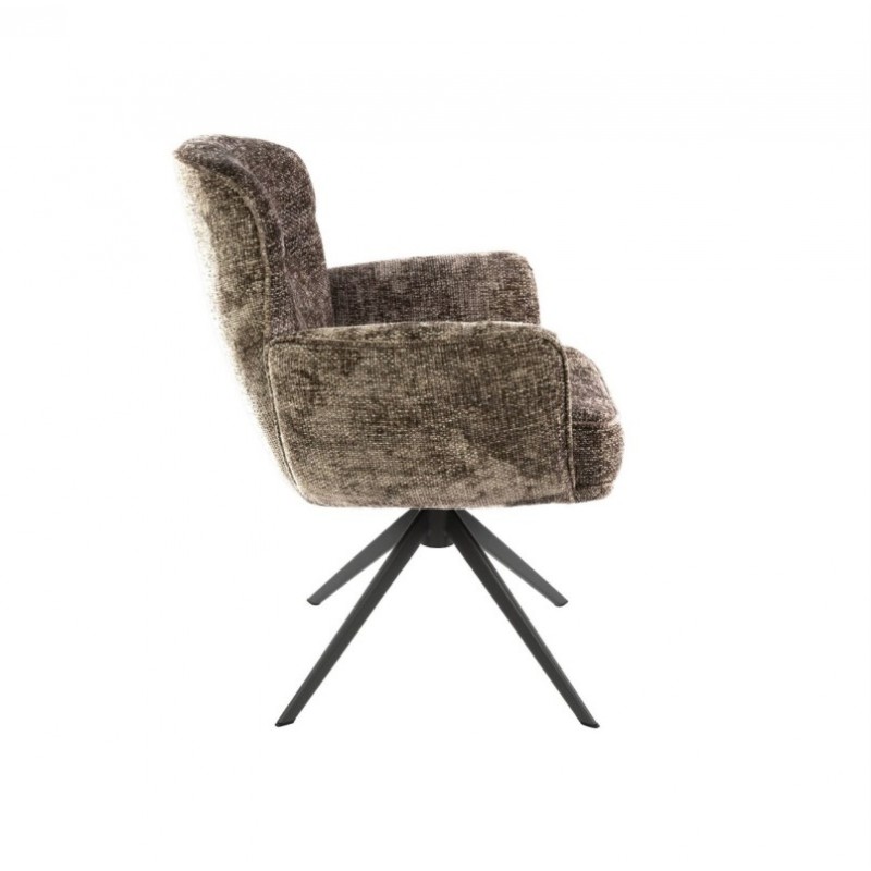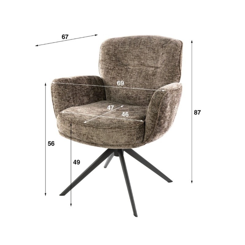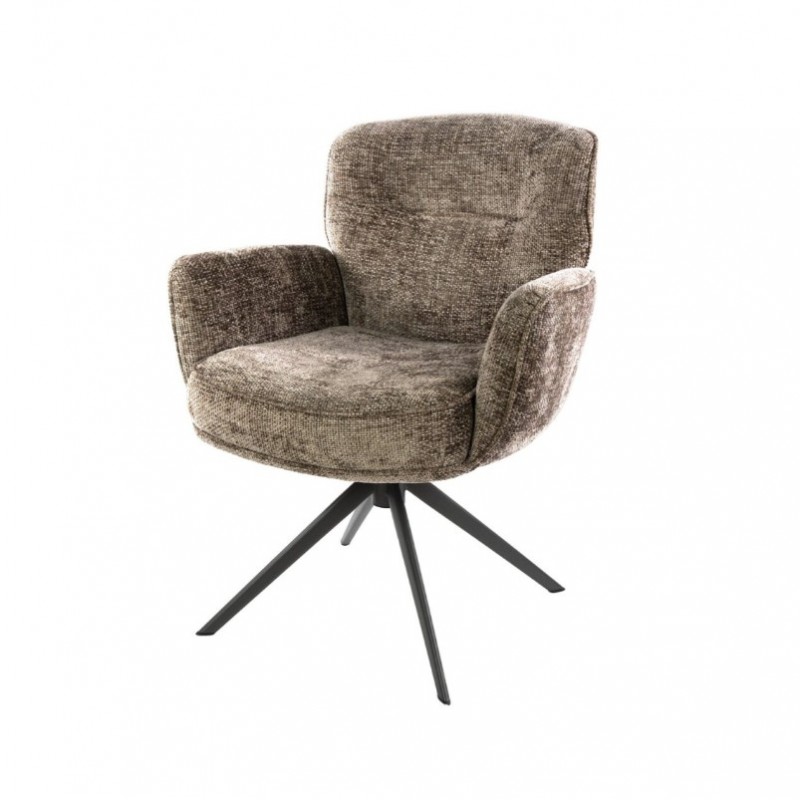 Nowoczesne krzesło XAVIER to mebel posiadający wiele korzyści w jednym produkcie, który bez wątpienia zachwyci swoim kształtem oraz starannym wykończeniem. Wygodne siedzisko, podłokietniki oraz oparcie utrzymane w brązowej tonacji idealnie współgra z obrotową ciemną metalową podstawą. Niewątpliwym atutem krzesła jest zastosowanie sprężyn kieszeniowych typu pocket, jak również stylowy wygląd oraz subtelnie zaokrąglone kształty, podkreślające jego wyjątkowy charakter. Mebel ten posiada doskonale wyprofilowane oparcie oraz siedzisko zaprojektowane w taki sposób aby odpowiednio wspierało sylwetkę siedzącego. Ponadto charakterystyczną jego cechą jest zastosowanie bardzo modnych i zarazem oryginalnych krzywizn na oparciu oraz podłokietnikach, dzięki czemu efekt końcowy połączenia brązowego korpusu siedziska wraz z metalowa podstawą jest fenomenalny nadając całości niezwykle wyjątkowy design. Mebel ten wyróżnia się przede wszystkim swoją oryginalną formą oraz bardzo ciekawym wyglądem dzięki zastosowaniu na nim modnej strukturalnej szenilowej tkaniny w kolorze taupe o gramaturze plecionej. Takie połączenie kolorów to kompozycja, która idealnie sprawdzi się w jadalni oraz salonie urządzonych w stylu nowoczesnym dodając przestrzeni niezwykle oryginalnego charakteru.