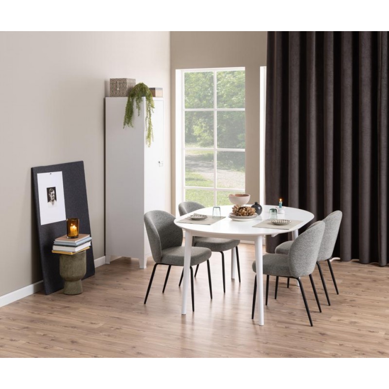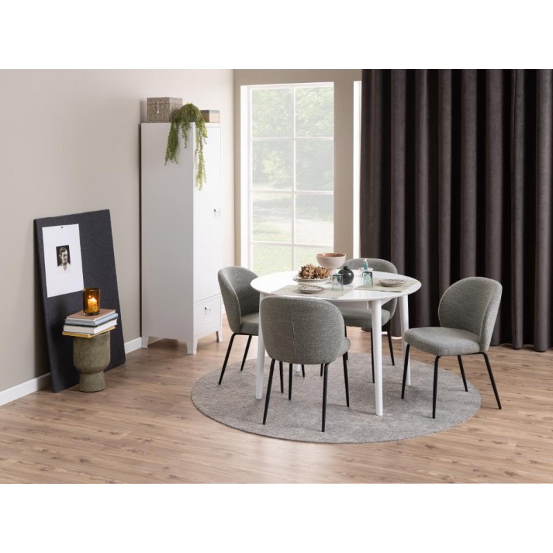 Krzesło do stołu kuchennego zostało wykonane z pięknej, szarej tkaniny plecionej. Wyprofilowane oparcie gwarantuje wygodne miejsce do siedzenia i stylowy element wyposażenia każdego domu na długi czas. Szara kolorystyka w połączeniu z czarnymi, metalowymi nogami, prezentuje się niezwykle elegancko i pasuje do wielu nowoczesnych wystrojów w salonów lub jadalni.