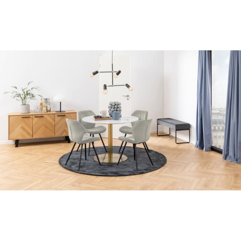 Nowoczesny design oraz wysoka jakość materiałów z których to krzesło kuchenne zostało wykonane zapewnia wygodne miejsce do siedzenia i stylowy element wyposażenia każdego domu na długie lata. Tkanina welurowa w kolorze beżowym w połączeniu z czarnymi metalowymi nogami prezentuje się bardzo elegancko i pasuje do wielu nowoczesnych salonów.