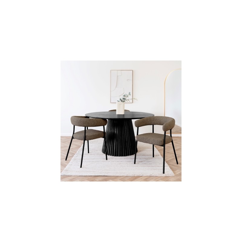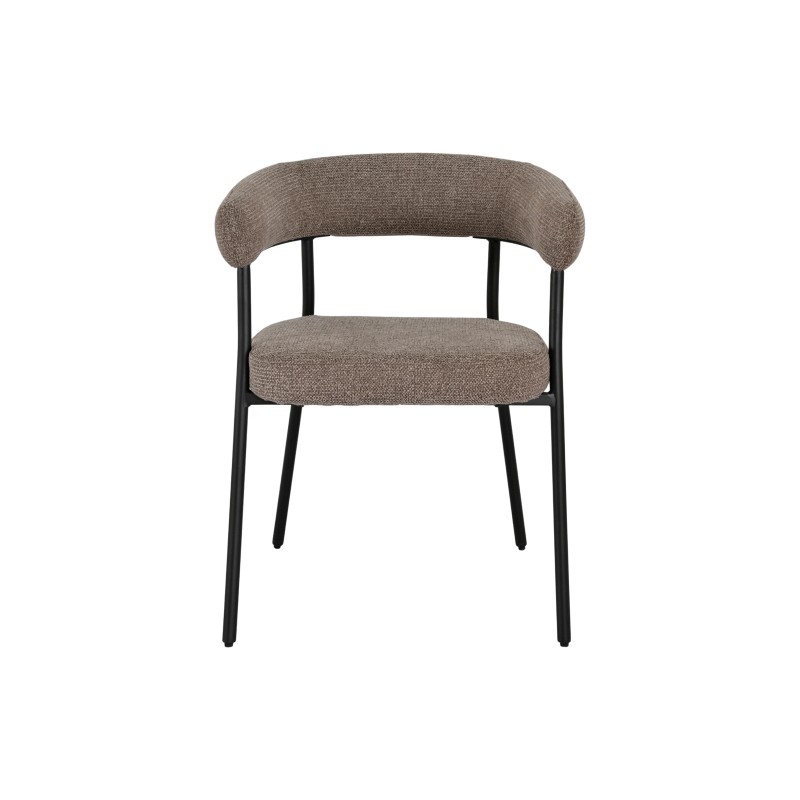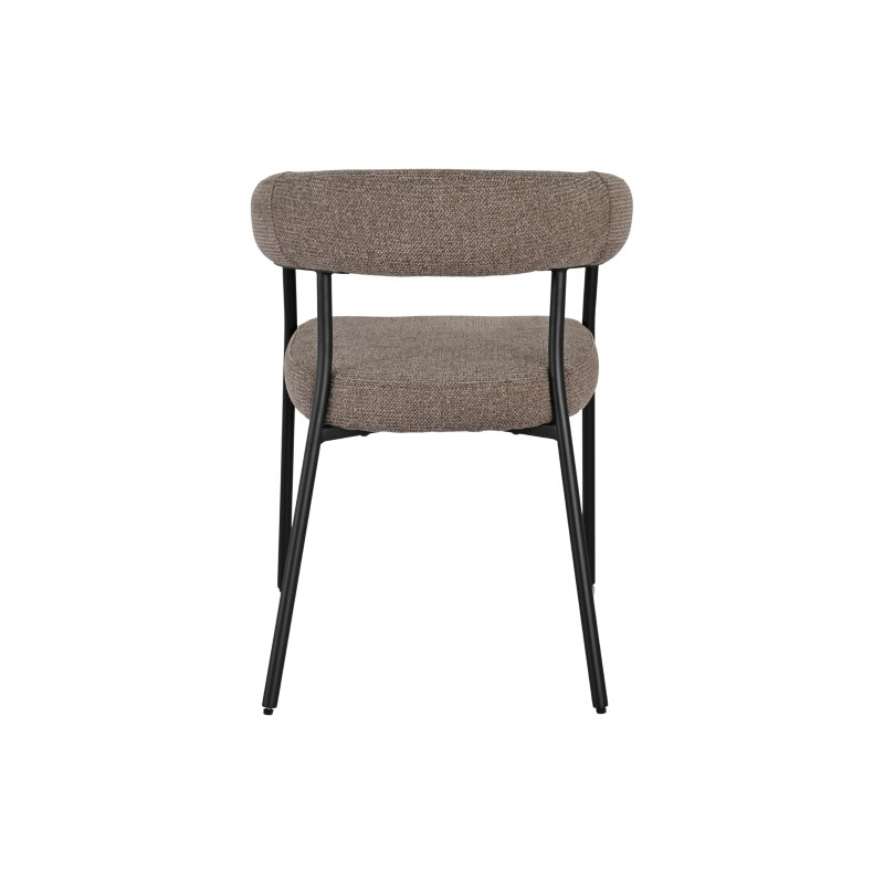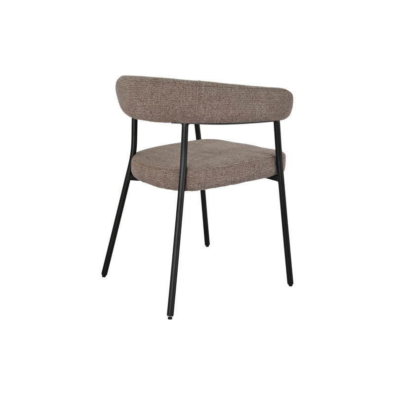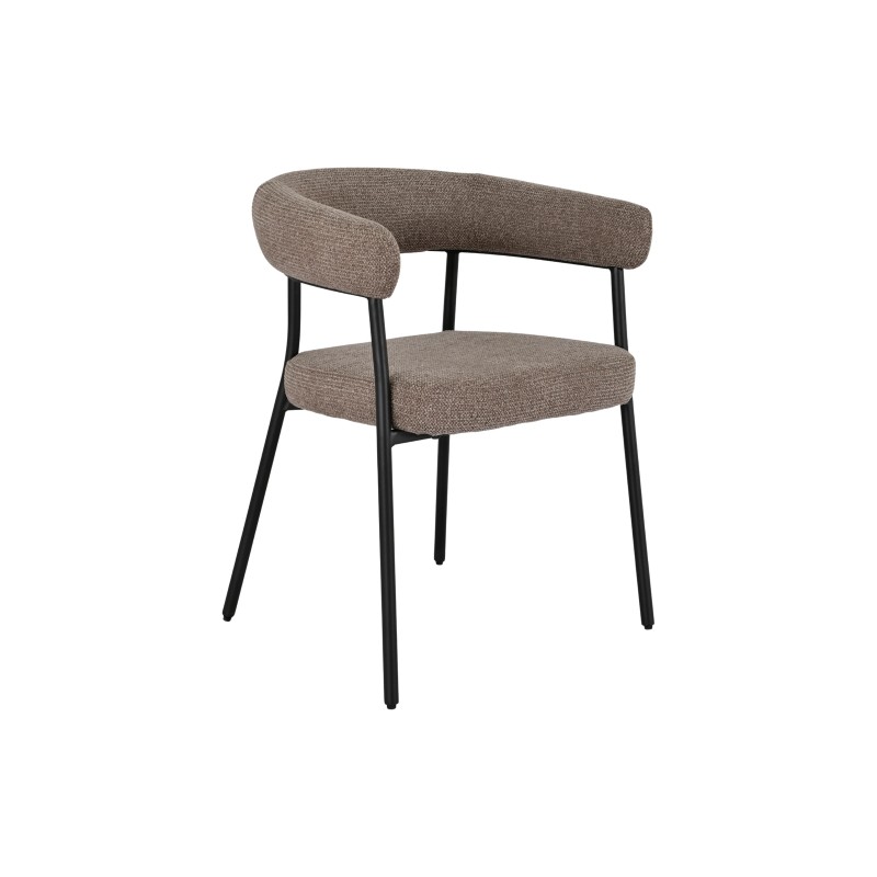 Miękkie, tapicerowane siedzisko w ciepłym odcieniu brązu nadaje wnętrzu przytulny charakter, a jego czarne, smukłe nogi z metalu dodają mu lekkości i nowoczesnego wyrazu. Idealnie sprawdzi się zarówno w jadalni, jak i w salonie lub biurze – wszędzie tam, gdzie liczy się styl i komfort.