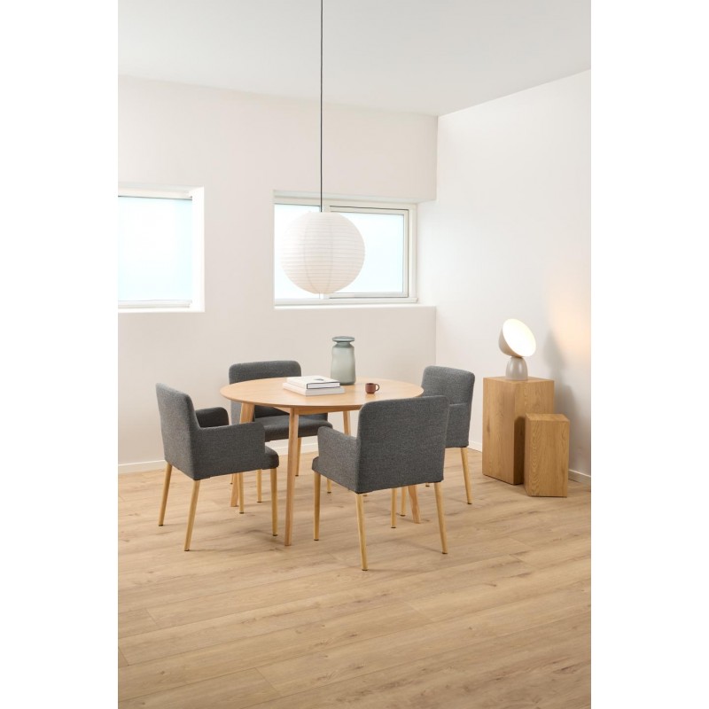 Krzesło ZOE z funkcjonalnymi podłokietnikami łączy ze sobą styl i komfort, będąc doskonałym uzupełnieniem nowoczesnej jadalni i salonu. Idealny kształt mebla nadaje wnętrzu przyjazny i harmonijny charakter. Siedzisko zostało otapicerowane miękką, antracytową tkaniną bouclé w odcieniu antracytowym, co sprawia, że krzesło jest zarówno eleganckie, jak i bardzo wygodne w użytkowaniu. Całość została osadzona na okrągłych, drewnianych nogach z lakierowanym wykończeniem, które podkreślają jego naturalny i przytulny wygląd.