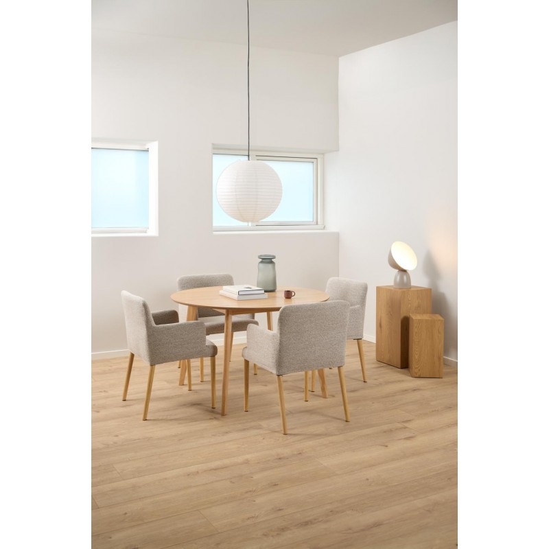 Krzesło ZOE z funkcjonalnymi podłokietnikami łączy ze sobą styl i komfort, będąc doskonałym uzupełnieniem nowoczesnej jadalni i salonu. Idealny kształt mebla nadaje wnętrzu przyjazny i harmonijny charakter. Siedzisko zostało otapicerowane miękką, antracytową tkaniną bouclé w odcieniu beżowym, co sprawia, że krzesło jest zarówno eleganckie, jak i bardzo wygodne w użytkowaniu. Całość została osadzona na okrągłych, drewnianych nogach z lakierowanym wykończeniem, które podkreślają jego naturalny i przytulny wygląd.