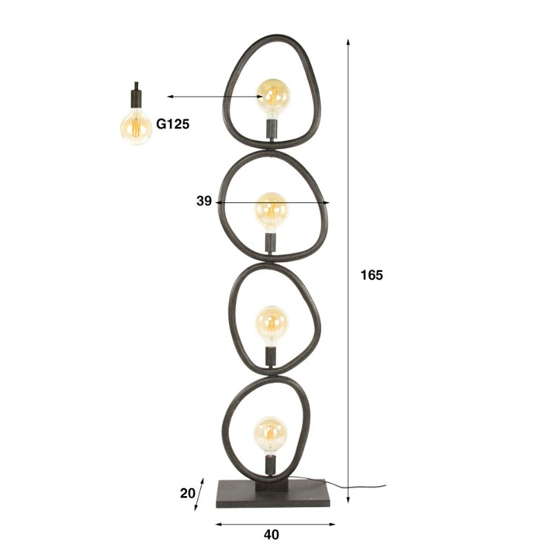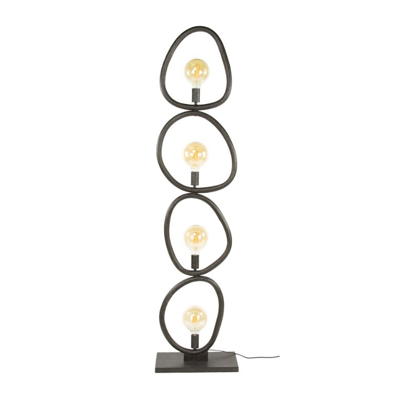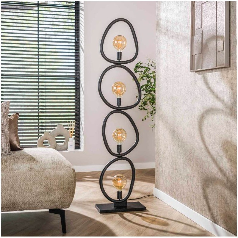 Lampa podłogowa BERNA łączy w sobie wyjątkowy element oświetleniowy oraz nowoczesny design z industrialnym charakterem. Jej konstrukcja oparta jest na czterech geometrycznych kloszach o owalnym kształcie, wykonanych z metalu o wykończeniu antycznej czerni. Dzięki takiej oprawie wszystkie źródła światła są w pełni wyeksponowane, co pozwala uzyskać efekt przestrzennego, harmonijnego oświetlenia. Otwarta konstrukcja kloszy sprawia, że żarówki pełnią nie tylko funkcję użytkową, ale również dekoracyjną, dodając wnętrzu wyjątkowego charakteru. Emitowane przez lampę ciepłe światło tworzy przytulną atmosferę, idealną do salonu, sypialni czy nawet eleganckiego biura. Dzięki swojej nietuzinkowej formie i oryginalnemu wyglądowi bez wątpienia przyciąga wzrok, stając się jednocześnie efektowną ozdobą każdego nowoczesnego wnętrza. Cztery punkty światła doskonale rozpraszają blask po całym pomieszczeniu, pozwalając lampie emitować ciepłe jednocześnie wprowadzając przytulny nastrój. BERNA to doskonały wybór dla osób ceniących połączenie funkcjonalności z unikalnym designem, który wzbogaci zarówno wnętrza loftowe, jak i klasyczne aranżacje.