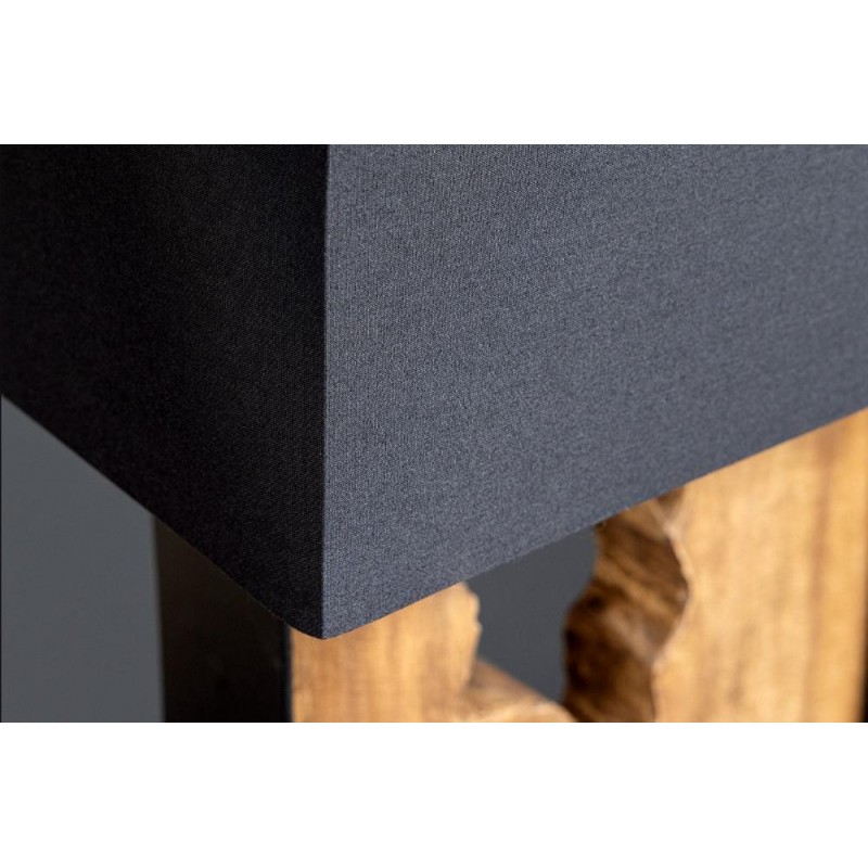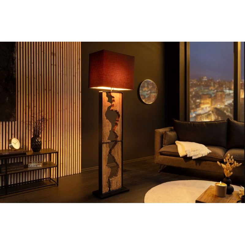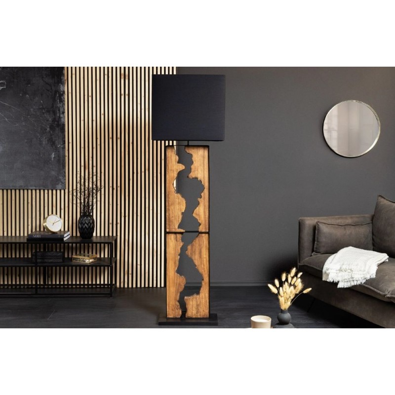 Lampa podłogowa DESIGNED BY NATURE to wyjątkowe połączenie nowoczesnego designu i naturalnego stylu. Wykonana została ręcznie z drewna deszczowego w naturalnym odcieniu, które zachwyca swoją formą. Każdy egzemplarz różni się unikatowym wykończeniem konstrukcji czyniąc ją niepowtarzalną, a odwzorowanie naturalnej struktury drewna z widocznymi słojami i sękami, podkreśla naturalny charakter lampy świadcząc o niezwykłej precyzji jej wykonania. Podłużna, geometryczna podstawa, wzbogacona o dwa drewniane elementy osadzone w metalowej konstrukcji, nadają jej wyrafinowany charakter. Czarny kwadratowy abażur idealnie komponuje się ze złotym wnętrzem, który rozpraszając światło, tworzy przytulną atmosferę oraz interesujący kontrast z surowością podstawy. Lampa ta to nie tylko źródło światła, ale również jest to mebel doskonale łączący współczesny design z naturalnym stylem, a jej geometryczny kształt nadaje charakteru wnętrzu stając się atrakcyjnym dekoracyjnym dodatkiem nowoczesnego wyrafinowanego salonu.