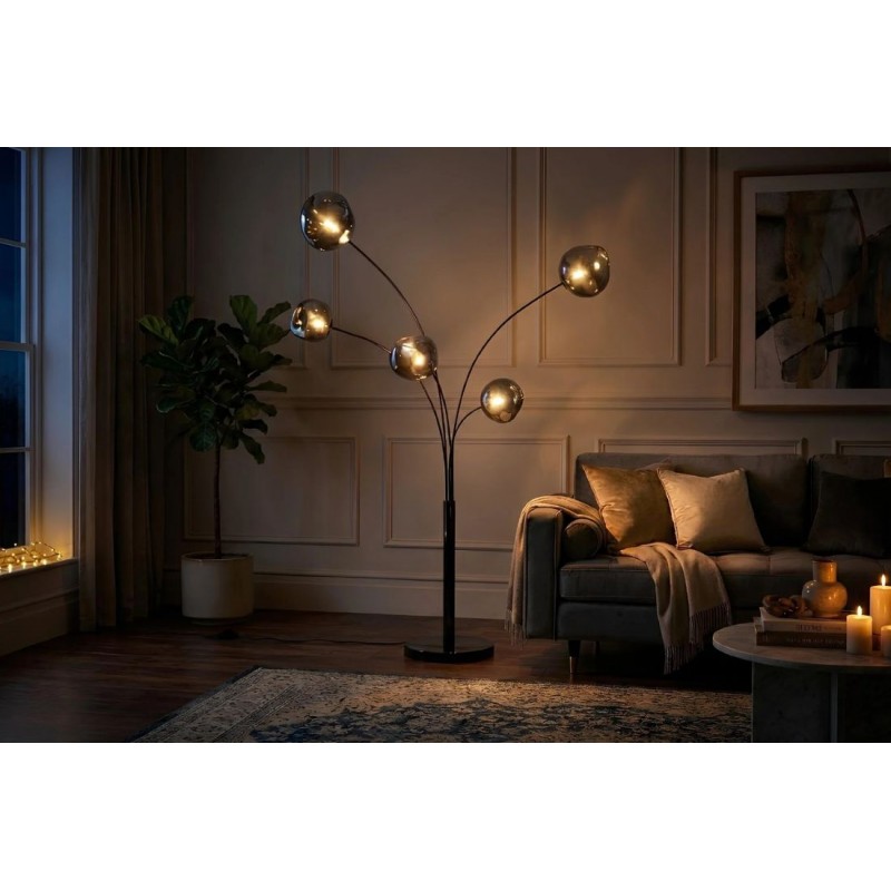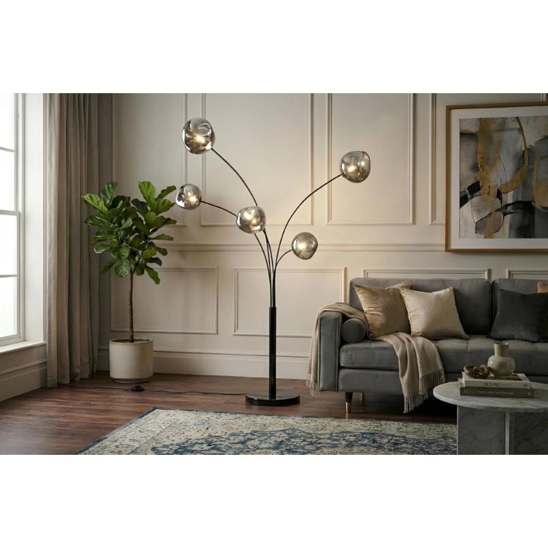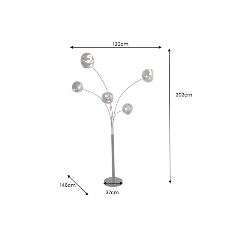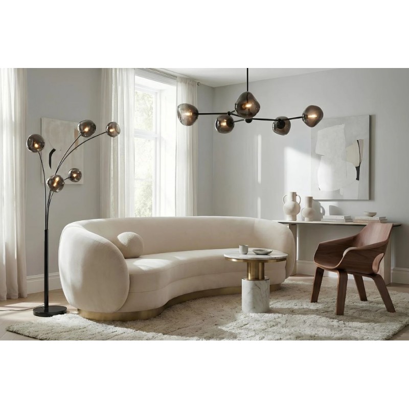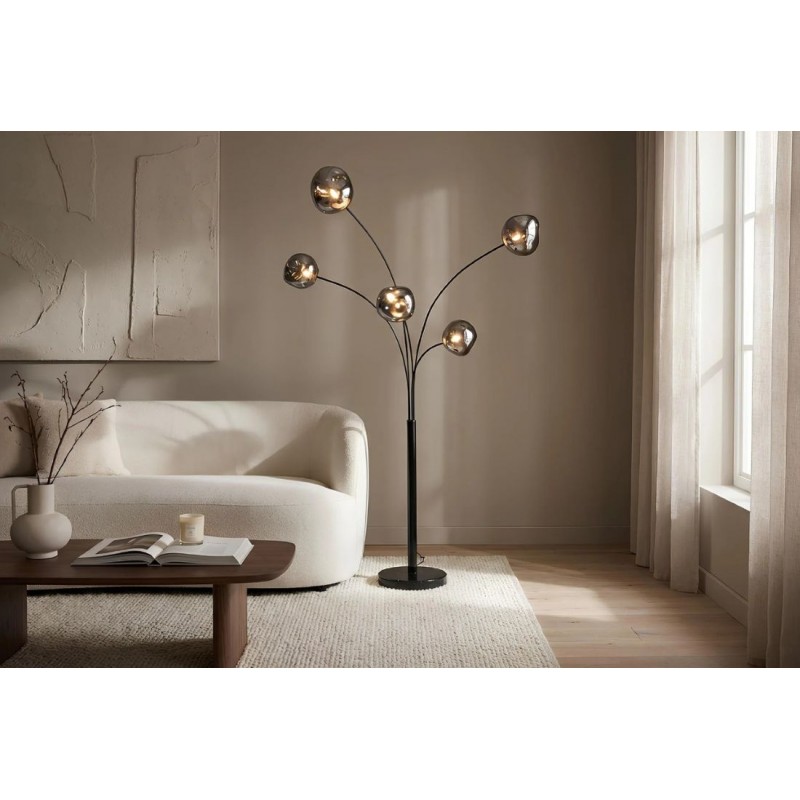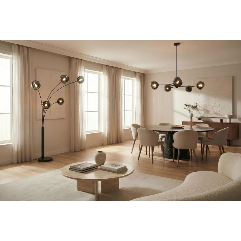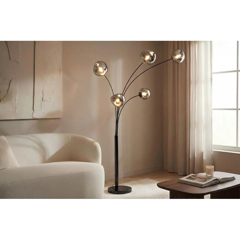 Lampa podłogowa LIQUID DIAMOND to idealne rozwiązanie do każdego pomieszczenia w stylu nowoczesnym, gdzie lampa ta będzie pełnić funkcję nie tylko oświetlenia, ale także przepięknej dekoracji, która przykuję uwagę każdego. Jej metalowa konstrukcja w odcieniu czerni została osadzona na okrągłej czarnej marmurowej podstawie o nietypowej strukturze, która nadaje całości wyrazistego charakteru i oryginalnego wyglądu. Głównym elementem lampy jest pięć asymetrycznych szklanych kloszy o różnej wielkości, których unikatowa forma oraz subtelna barwa dymionej czerni tworzy zjawiskowy efekt wizualny, idealnie współgrając z kolorem podstawy. LIQUID DIAMOND doskonale odnajdzie się nie tylko w salonie czy korytarzu, ale również w sypialni, wprowadzając do wnętrza ciepło, elegancję i niepowtarzalny klimat. Dzięki wyjątkowej strukturze kloszy światło rozchodzi się w niezwykle efektowny sposób, pięknie rozświetlając przestrzeń. Efekt końcowy połączenia kolorów kloszy z podstawą utrzymaną w jednej tonacji jest fenomenalny nadając całości piękny i niepowtarzalny wygląd.