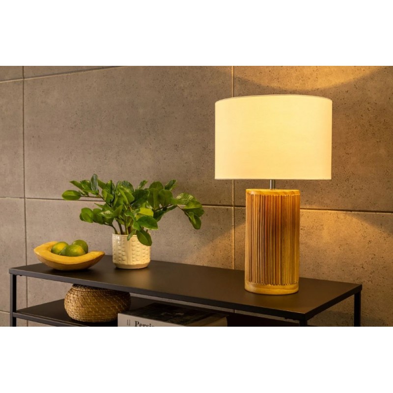 Lampa stołowa GATSBY to idealne rozwianie do każdego wnętrza w stylu nowoczesnym ORAZ skandynawskim, gdzie doda wnętrzu ciepła i naturalnego wykończenia, a także swoją formą przykuje uwagę każdego. Głównym atutem mebla jest jego unikalna podstawa, która została stworzona z wielu pionowych elementów, które wyglądem przypominają cieniutkie lamele tworząc harmonijną całość. Na tej niesamowitej podstawie został umieszczony biały klosz, który ją idealnie dopełnia nadając jej unikalnego stylu. Lampa ta to nie tylko źródło światła, ale również jest to mebel, który doskonale łączy współczesny design z naturalnym stylem, jej kształt nadaje charakteru wnętrzu stając się atrakcyjnym i bardzo uniwersalnym dodatkiem dekoracyjnym nowoczesnego eleganckiego i wyrafinowanego salonu.