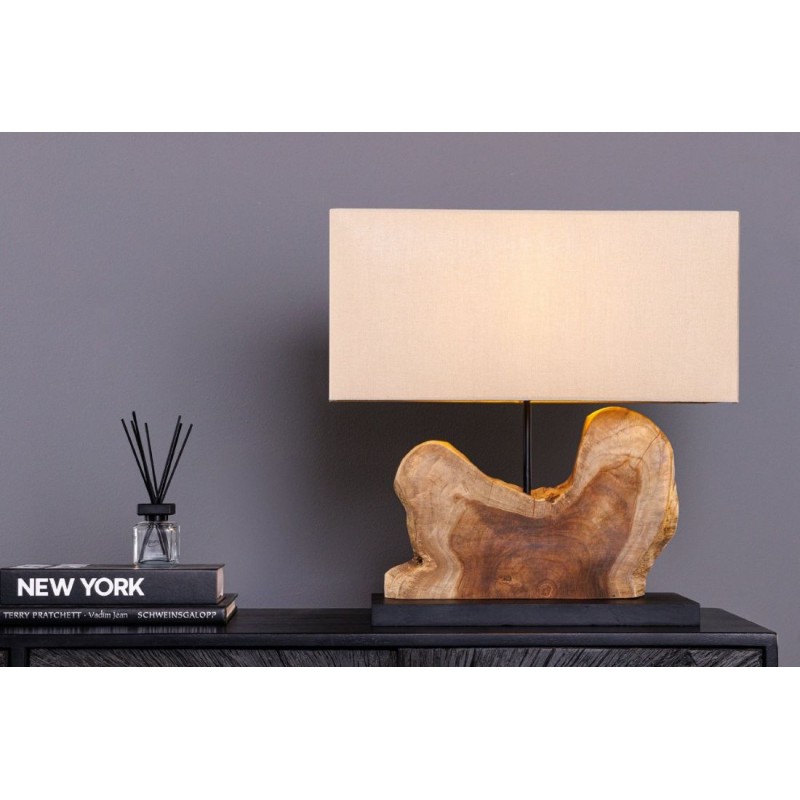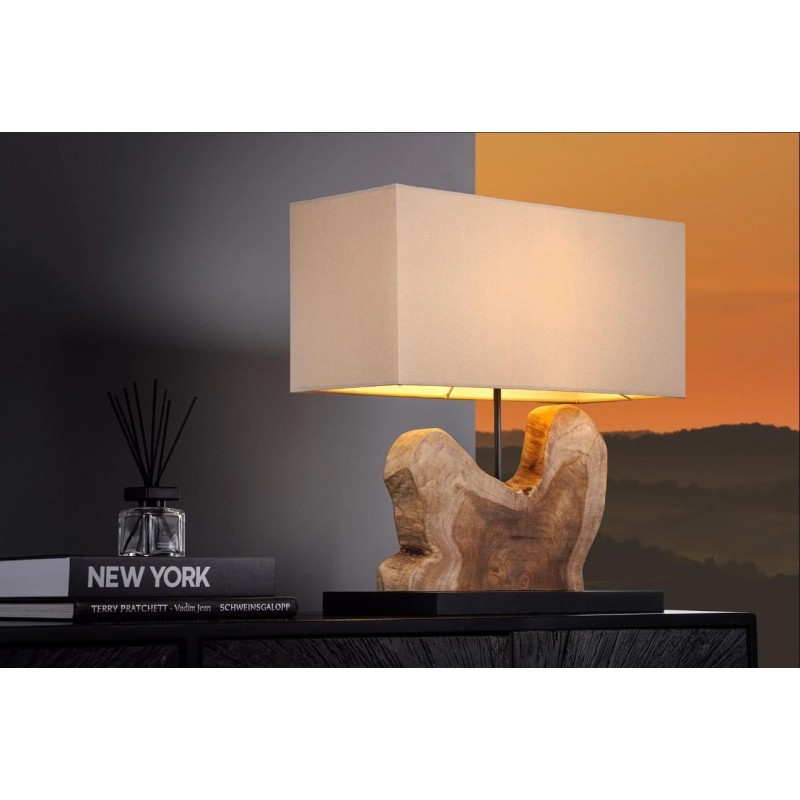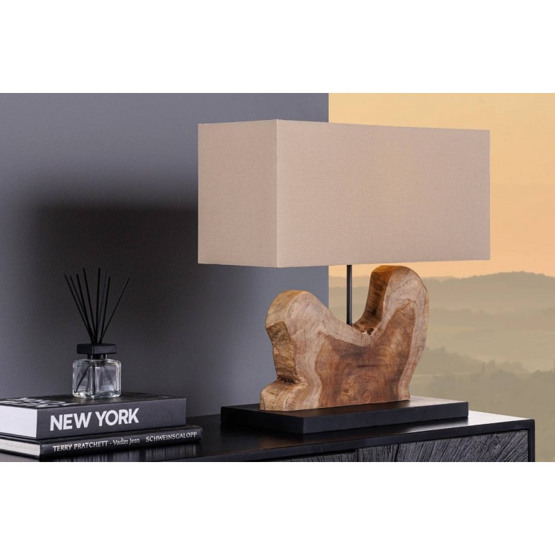 Lampa HYPNOTIC to idealne rozwiązanie do każdego wnętrza urządzonego w stylu nowoczesnym, gdzie bez wątpienia doda mu ciepła oraz naturalnego wykończenia. Jej przyciągająca wzrok geometryczna podstawa została wykonana z litego drewna tekowago z bardzo dużą precyzją, a dzięki zachowanej oryginalnej strukturze drewna w postaci sęków i słojów została uwydatniona jej naturalność drzewa. Całość dopełnia prostokątny klosz wykonany z modnej lnianej tkaniny w beżowym kolorze, który doskonale współgra z naturalnym odcieniem drewna. Jej nietypowy wygląd oraz kształt od razu przyciąga wzrok sprawiając, że może ona stać się unikatową ozdobą nowoczesnej sypialni, salonu oraz biura. Lampa stołowa HYPNOTIC to nie tylko źródło światła, ale również dekoracyjny akcent nadający przestrzeni wyjątkowego designu, wprowadzając jednocześnie do wnętrza odrobinę natury oraz elegancki nowoczesny styl.