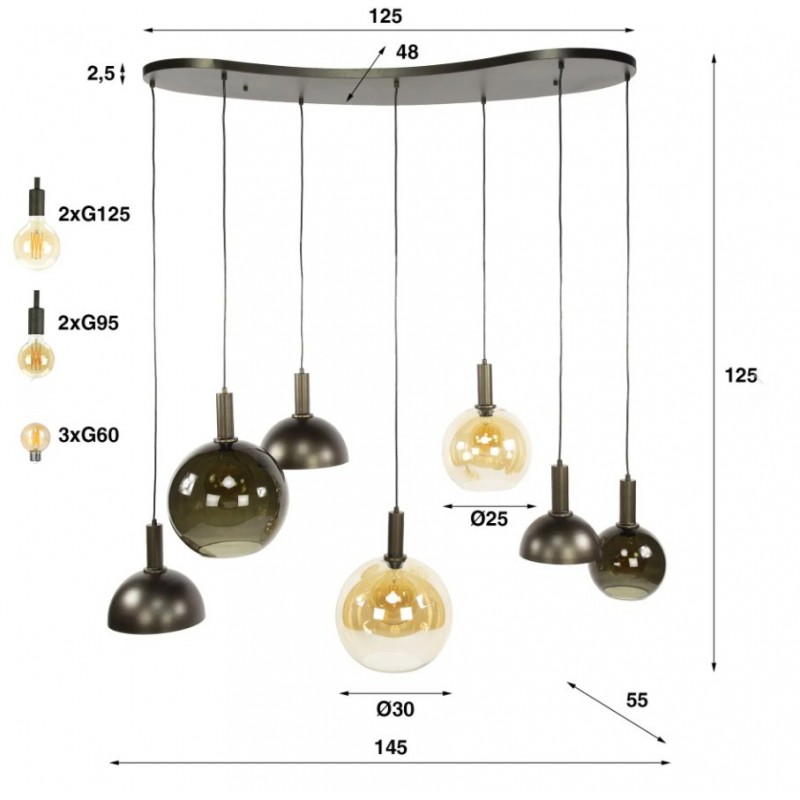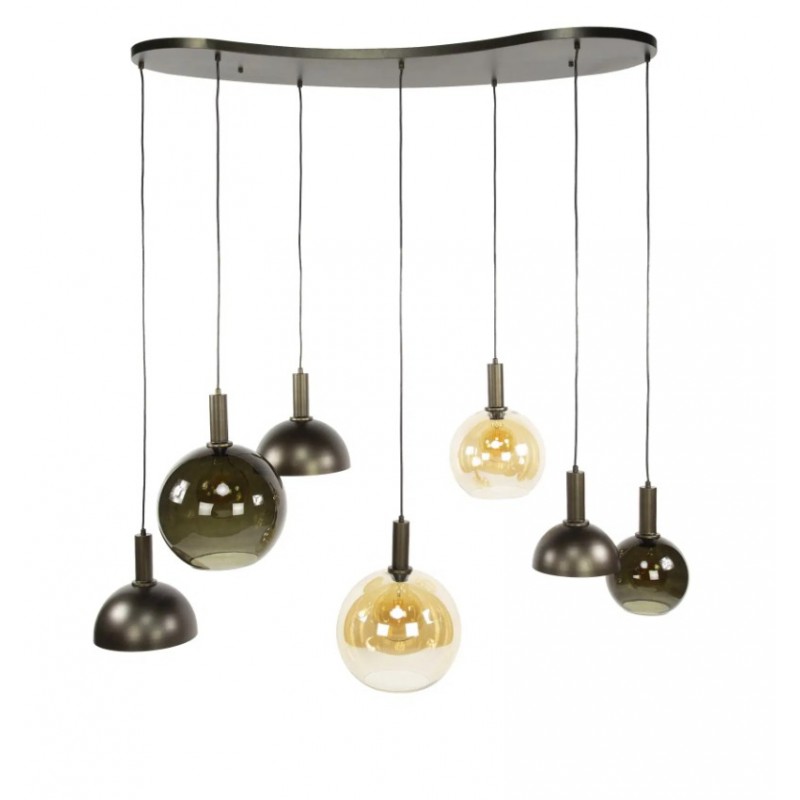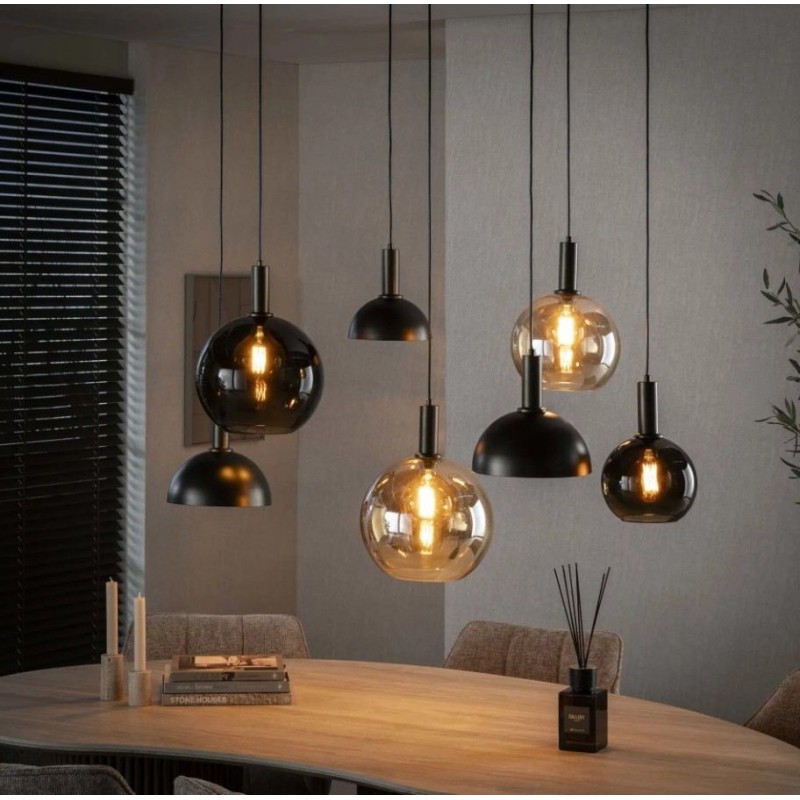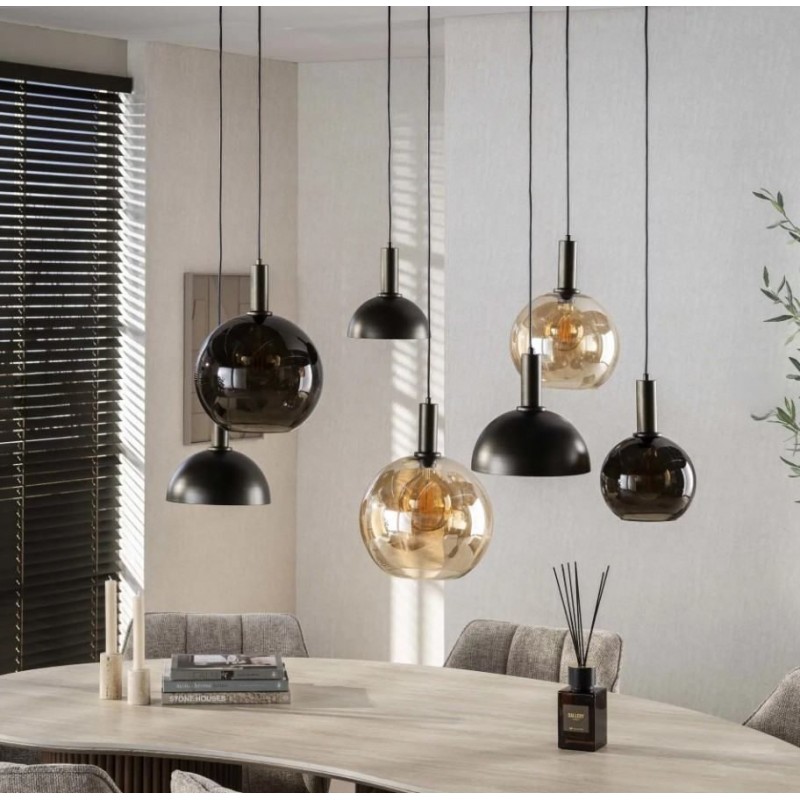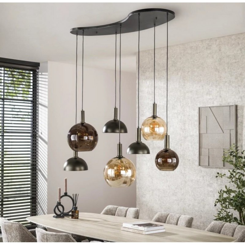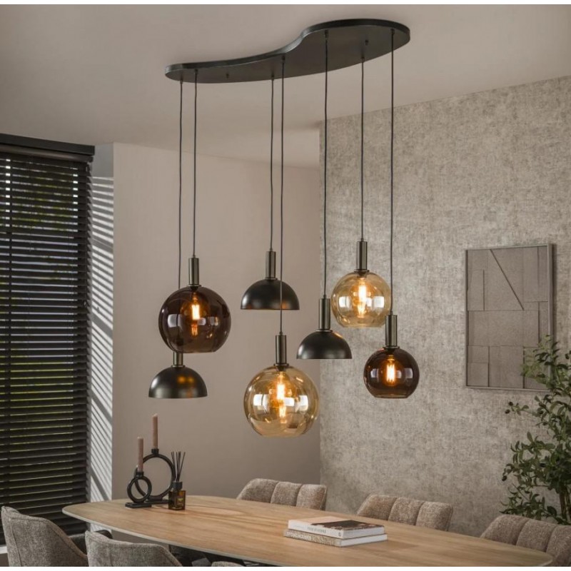 Lampa wisząca SAVAS to idealne rozwiązanie do każdego pomieszczenia w stylu industrialnym czy nowoczesnym, gdzie lampa ta będzie pełniła funkcję nie tylko oświetlenia, ale także stanie się przepiękną dekoracją, która przykuję uwagę każdego. Podstawę lampy stanowi półokrągła konstrukcja w odcieniu brązowym, której nietypowa struktura dodaje charakteru i ciekawego wyglądu. Główną ozdobą jest siedem kloszy o różnej wielkości, cztery z nich wykonano ze szkła w kolorze bursztynowym oraz dymionym, a pozostałe trzy z metalu o półokrągłej formie w odcieniu brązowym. Ich kształt i barwa sprawiają, że całość prezentuje się zjawiskowo, doskonale współgrając z ciemną podstawą. Dodatkowym atutem lampy jest wysokość, którą można swobodnie regulować do 150cm oraz dostosowując ją odpowiednio do własnych potrzeb. Lampa wisząca SAVAS sprawdzi się idealnie w każdym salonie, jadalni czy sypialni, gdzie doda wnętrzu ciepła i charakteru, a także dzięki niesamowitej strukturze klosza przepięknie rozświetli pomieszczenie.
