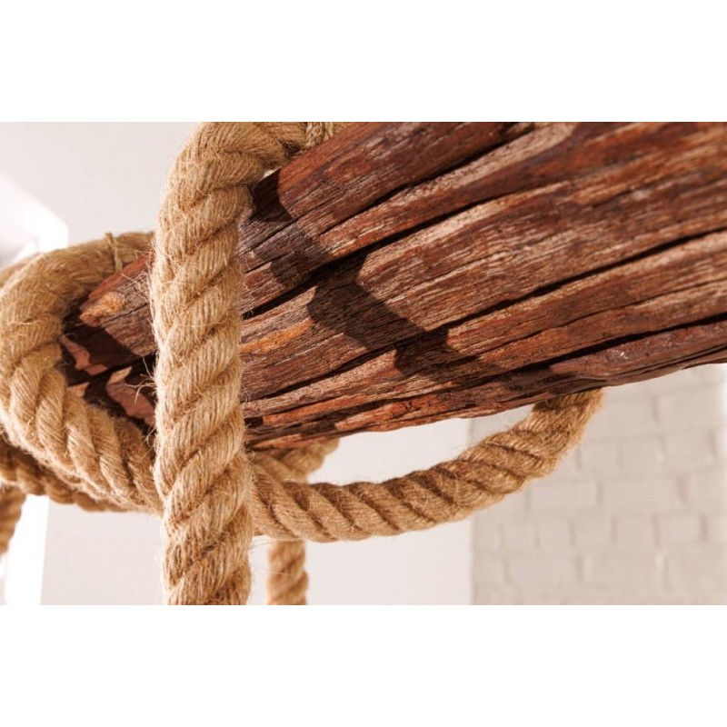 LAMPA WISZĄCA BARRACUDA 152 CM Posiada 5 źródła światła usytuowanych na ozdobnych linach owiniętych na drewnianym elemencie. Wyglądem dekoracyjnie przypomina postarzałe drewno Lampa sprzedawana bez żarówek. W serii BARRACUDA występują także stoły, stoliki kawowe, komody, konsole, stojaki na wino, regały oraz lampy, - patrz produkty powiązane. Produkt...