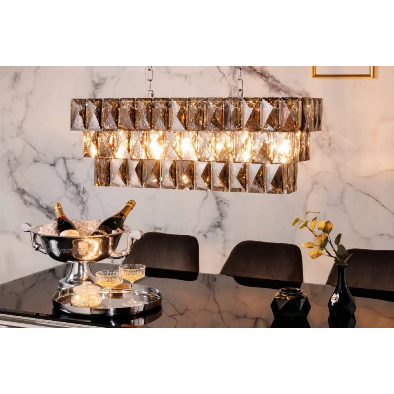 Lampa wisząca KRISTALL to stylowy i efektowny element wystroju, który doskonale wpisuje się w większe wnętrza, łącząc klasyczną elegancję z nowoczesnym wykończeniem. Stanowi nie tylko funkcjonalne źródło światła, ale również wyjątkową dekorację, przyciągającą wzrok i podkreślającą charakter wnętrza. Jej największym atutem bez wątpienia jest imponujący podłużny klosz wykonany z licznych, szarych, szklanych, asymetrycznych pryzmatów, które tworzą zjawiskowy efekt świetlny, subtelnie rozpraszając światło i dodając przestrzeni głębi oraz blasku. Możliwość zamontowania aż pięciu żarówek pozwala na równomierne i intensywne oświetlenie, które wprowadza do wnętrza ciepło, przytulność i elegancję. Srebrne dwa łańcuchy nie tylko dodają lampie charakteru, ale również umożliwiają wygodne zawieszenie jej na odpowiedniej wysokości, dostosowanej do potrzeb wnętrza. Połączenie szarego szkła z metalową podstawą w srebrnej tonacji daje niezwykle spójny, wyrafinowany efekt. Lampa KRISTALL idealnie odnajdzie się w salonie, jadalni, a także w przestronnych wnętrzach urządzonych w stylu glamour, industrialnym czy nowoczesnym. Dzięki swojej unikalnej formie i wysokiej jakości wykończeniu stanie się centralnym punktem aranżacji, dodając przestrzeni niesamowitej klasy, elegancji i niepowtarzalnego klimatu.