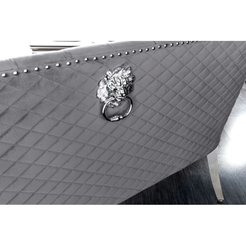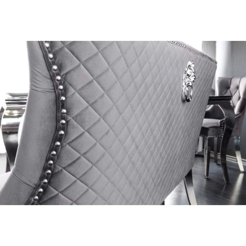 Ta nowoczesna ławka CASTLE DELUXE to funkcjonalne i praktyczne rozwiązanie pasujące zarówno do stylowej jadalni jak i salonu. Jej podłużne siedzisko wraz z oparciem obito aksamitną tkaniną w kolorze szarym. Mebel w całości osadzony został na stabilnej metalowej chromowanej srebrnej podstawie, którą stanowią długie smukłe nogi. W wewnątrz oparcia zastosowano piękne stylowe wykończenie w formie zdobień oraz pikowań z guzikami, natomiast na jej zewnętrznej stronie uwidoczniono dekoracyjne przeszycia wraz z metalową kołatkę z głową lwa. Ponadto oryginalne krzywizny, zdobienia, wygodne siedzisko oraz smukła srebrna metalowa podstawa nadają jej wyjątkowy design. Prezentowana ławka wykonana jest z wysokiej jakości materiałów nadających wnętrzu ekskluzywny wygląd, zapewniając tym samym wygodne miejsce do siedzenia. Ważnym elementem jest wyprofilowane oparcie oraz siedzisko, które odpowiednio wspierają sylwetkę siedzącego podczas jej użytkowania. Sprawdzi się zarówno w minimalistycznych klasycznych oraz nowoczesnych aranżacjach, jak i w tych bogato zdobionych w stylu barokowym oraz glamour.