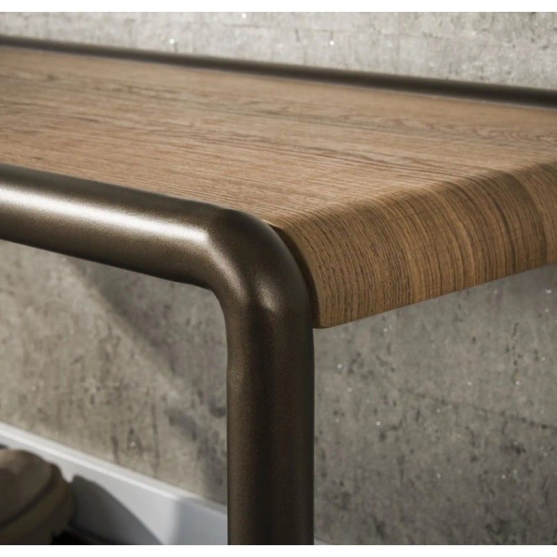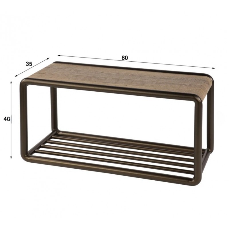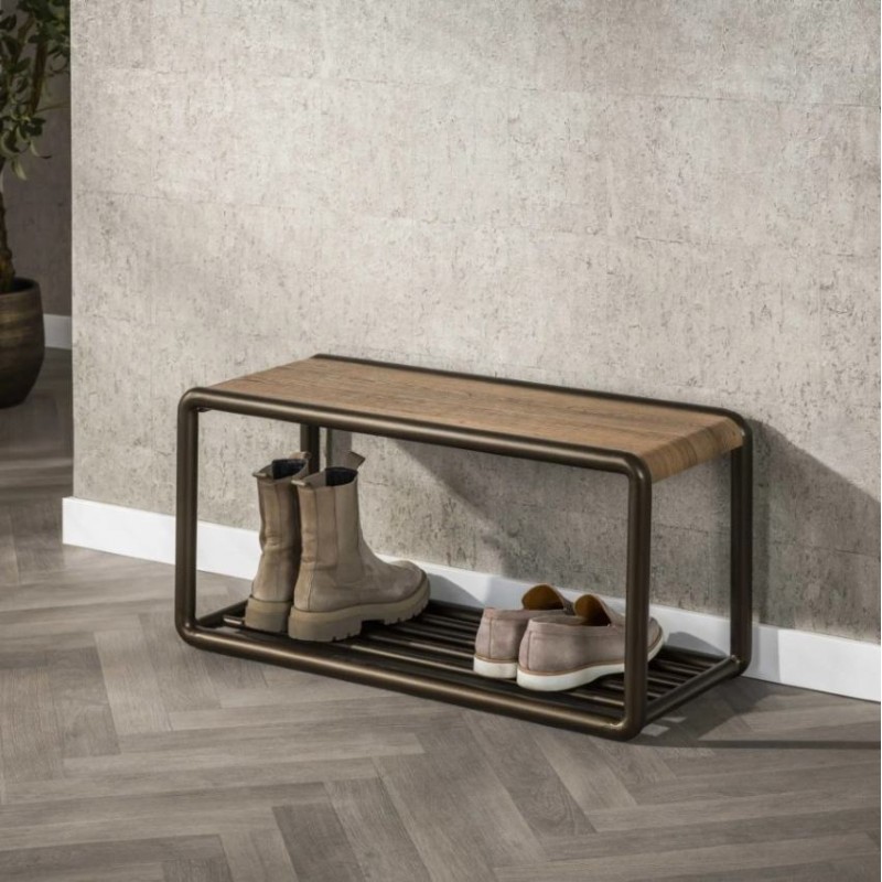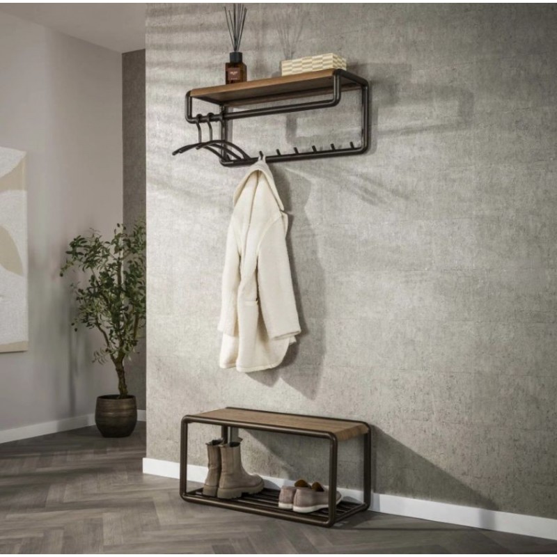 Ławka ELMER doskonale uzupełni przestrzeń przedpokoju, salonu, a nawet poczekalni, oferując idealne miejsce do przechowywania odzieży oraz funkcję półki w formie wygodnego siedziska. Wyposażono ją w praktyczną, górną półkę wykonaną z płyty MDF pokrytej drewnianym dekorem, która świetnie sprawdzi się do przechowywania czapek, szali, kapeluszy i innych elementów garderoby. Dodatkowo mebel posiada dolną metalową półkę przeznaczoną na obuwie, co zwiększa jego funkcjonalność w codziennym użytkowaniu. Stelaż ławki, w całości wykonany z metalu, opiera się na stabilnej konstrukcji utrzymanej w eleganckim brązowym odcieniu. Mebel można również szybko i sprawnie zamontować na ścianie, a takie rozwiązanie bez wątpienia pozwala zaoszczędzić miejsce na podłodze, czyniąc ją niezwykle praktycznym elementem wyposażenia, zwłaszcza w mniejszych pomieszczeniach. Dzięki swojej funkcjonalności oraz prostej, nowoczesnej formie, ławka ELMER znakomicie odnajduje się zarówno we wnętrzach nowoczesnych, jak i industrialnych, stając się nie tylko użytkowym meblem, lecz także efektowną dekoracją, która doda wnętrzu niepowtarzalnego charakteru.