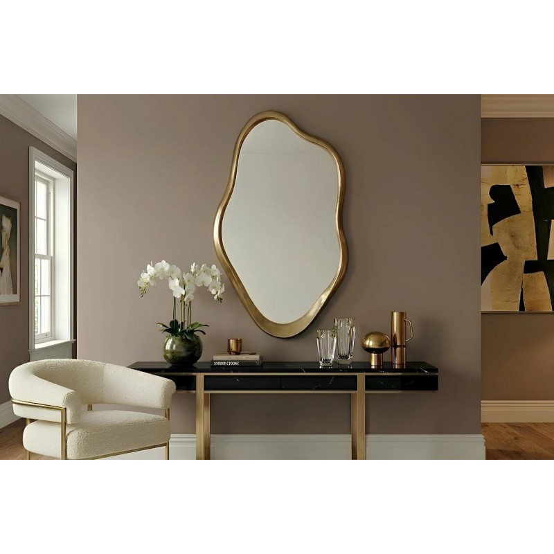 Lustro ścienne EMBER to wyjątkowy element dekoracyjny stworzony z myślą o osobach poszukujących nietypowych rozwiązań i unikalnego designu. Jego nieregularna geometryczna rama w złotym kolorze nadaje wnętrzu wyjątkowego charakteru, przyciągając wzrok i podkreślając indywidualny styl przestrzeni. Wykonana z poliuretanu rama wyróżnia się elegancją, a sam kształt lustra łączy estetykę z praktycznością. Lustro EMBER można łatwo zamontować na ścianie na preferowanej wysokości, co czyni je niezwykle uniwersalnym dodatkiem do każdego wnętrza. Doskonale pasuje zarówno do stylu glamour, jak i nowoczesnych aranżacji, gdzie nie tylko optycznie powiększy przestrzeń, ale także stanie się kluczowym akcentem dekoracyjnym. Bez wątpienia lustro to jest harmonijnym połączeniem funkcjonalności i oryginalnego designu, które wzbogaci każdy salon, sypialnię czy też przedpokój wprowadzając do ich wnętrza odrobinę luksusu i elegancji.