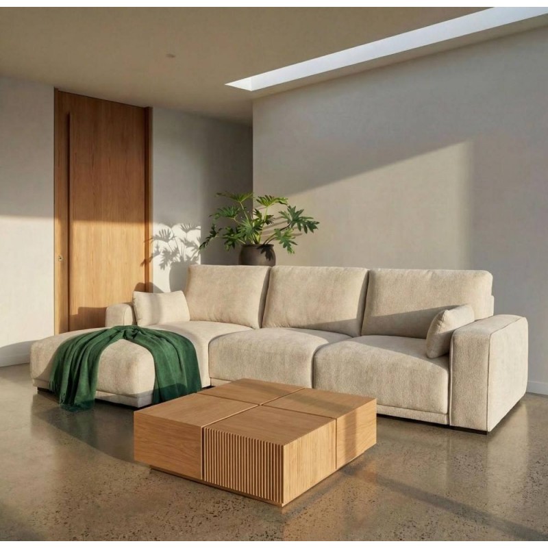 Narożnik California w kształcie litery L to połączenie nowoczesnego designu, wysokiego komfortu oraz solidnego wykonania. Jego elegancka, jasnobeżowa tapicerka wprowadza do wnętrza lekkość i przytulność, doskonale współgrając zarówno z minimalistycznymi, jak i bardziej klasycznymi aranżacjami. Prosta forma, szerokie podłokietniki oraz duży szezlong tworzą idealne warunki do codziennego relaksu.