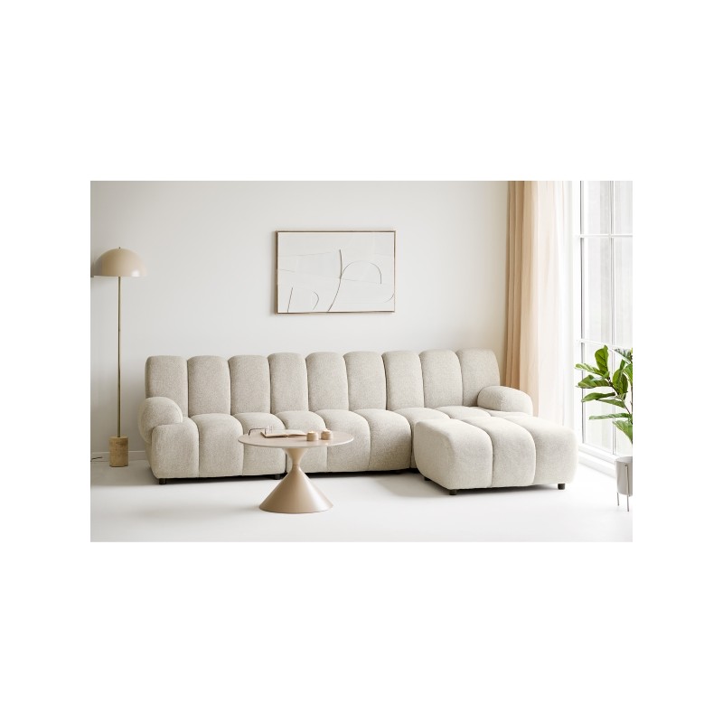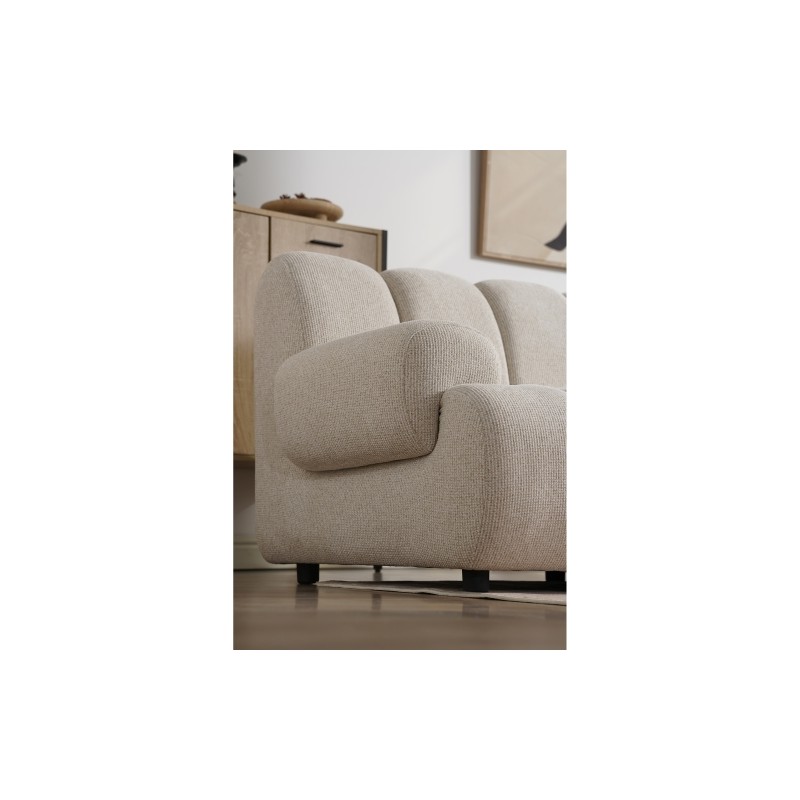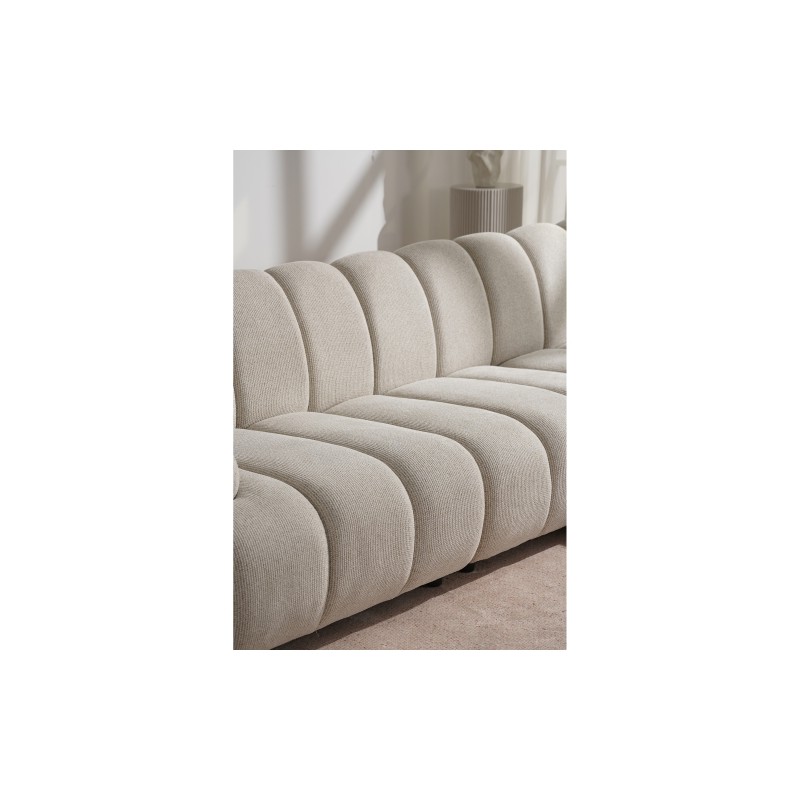 Model w subtelnym, piaskowym odcieniu doskonale wpisuje się w aktualne trendy aranżacyjne, nadając przestrzeni lekkości i elegancji. Miękkie, zaokrąglone formy oraz pionowe przeszycia podkreślają jego wyjątkowy charakter.